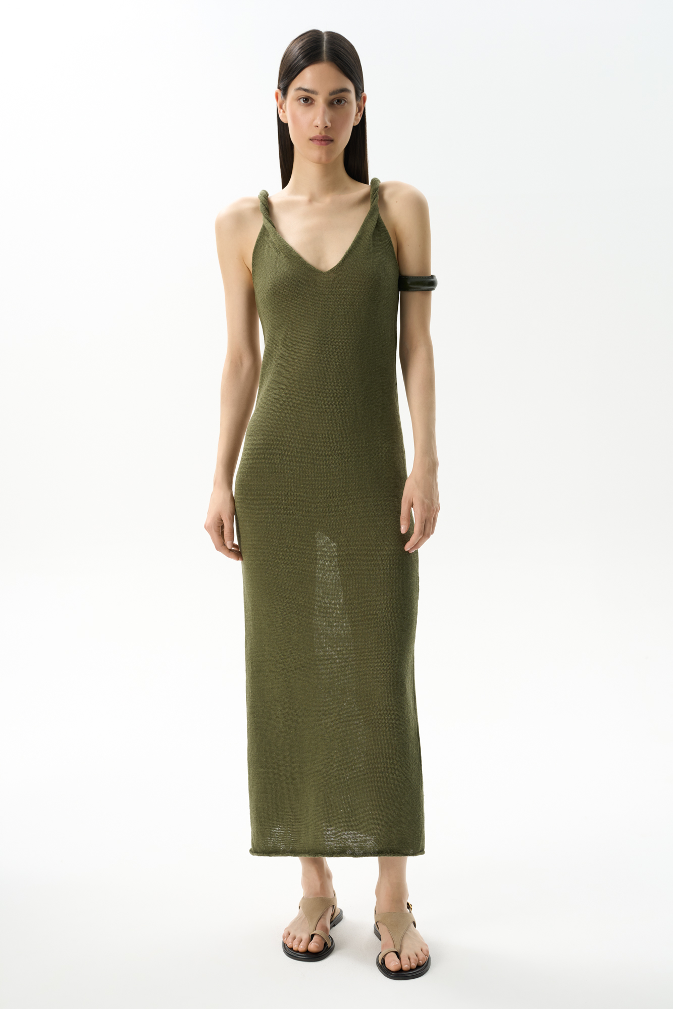 Maxi length sundress made of 100% linen. Straight fit model with twisted straps and V-neck.
