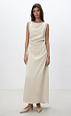 Satin midi length dress made of 100% viscose. The model has a fitted silhouette, sleeveless, with twist at the shoulders and drapery. Zip fastening at the back.