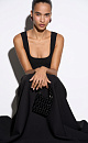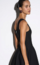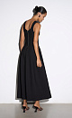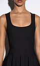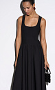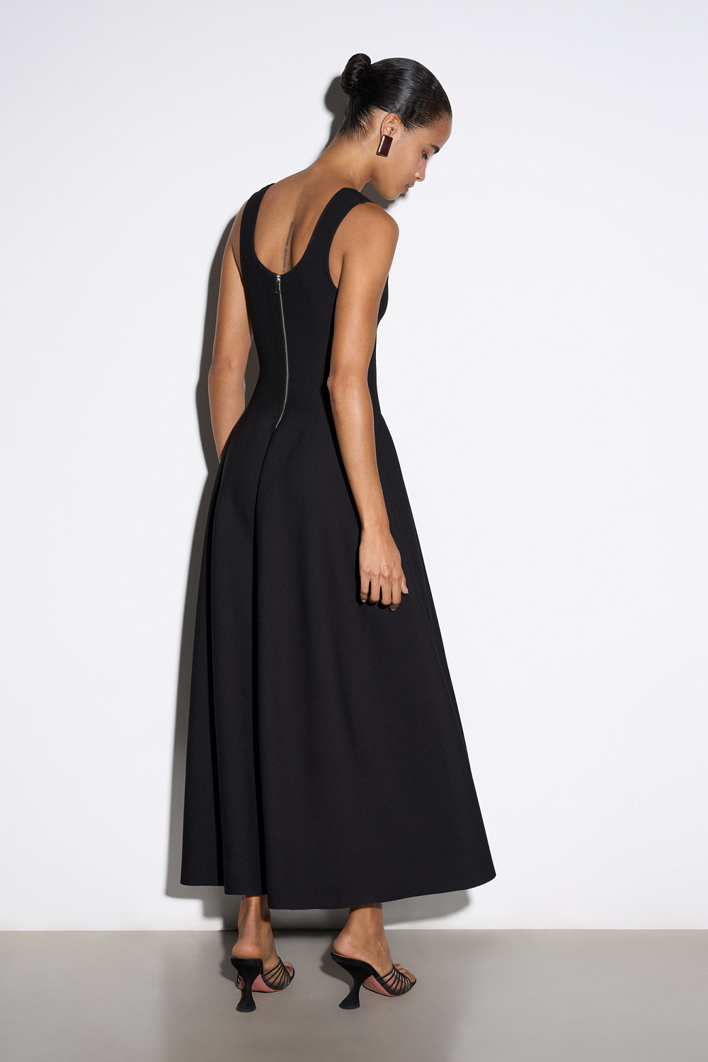 This midi-length knit viscose dress features a fitted silhouette, a flared skirt with soft pleats, sleeveless design, wide straps, and a square neckline.