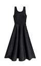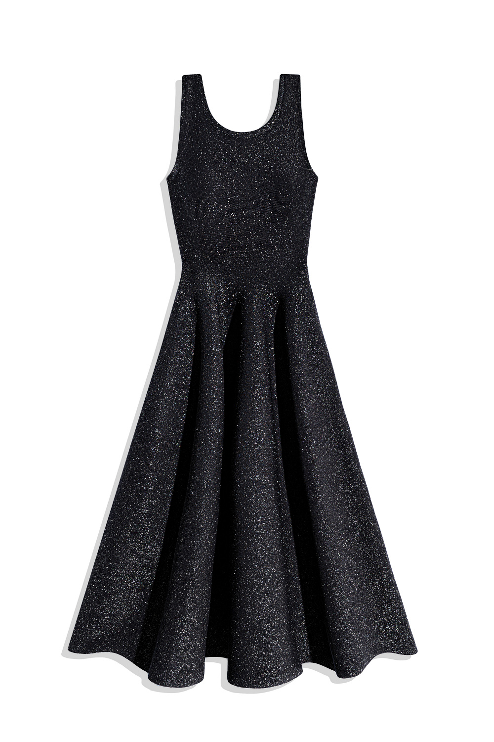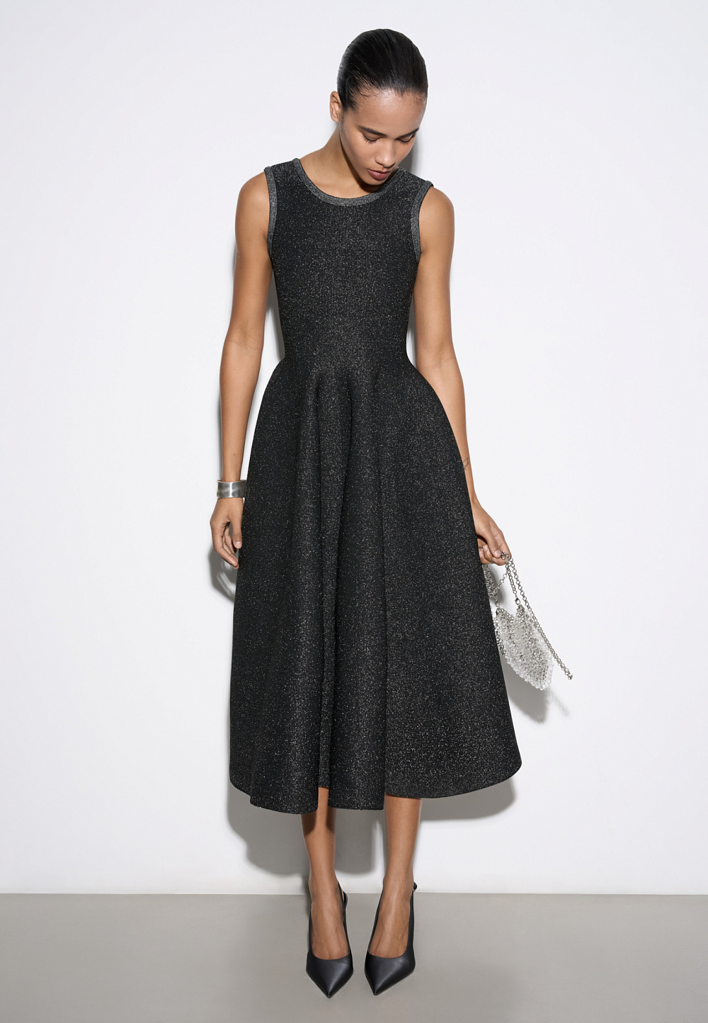 Knitted midi-length dress with lurex. A fitted model with a skirt flared from the waist, sleeveless, with wide straps.