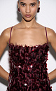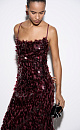 Evening sheath dress of midi length, decorated with sequins and fringe. Fitted model with thin adjustable straps.