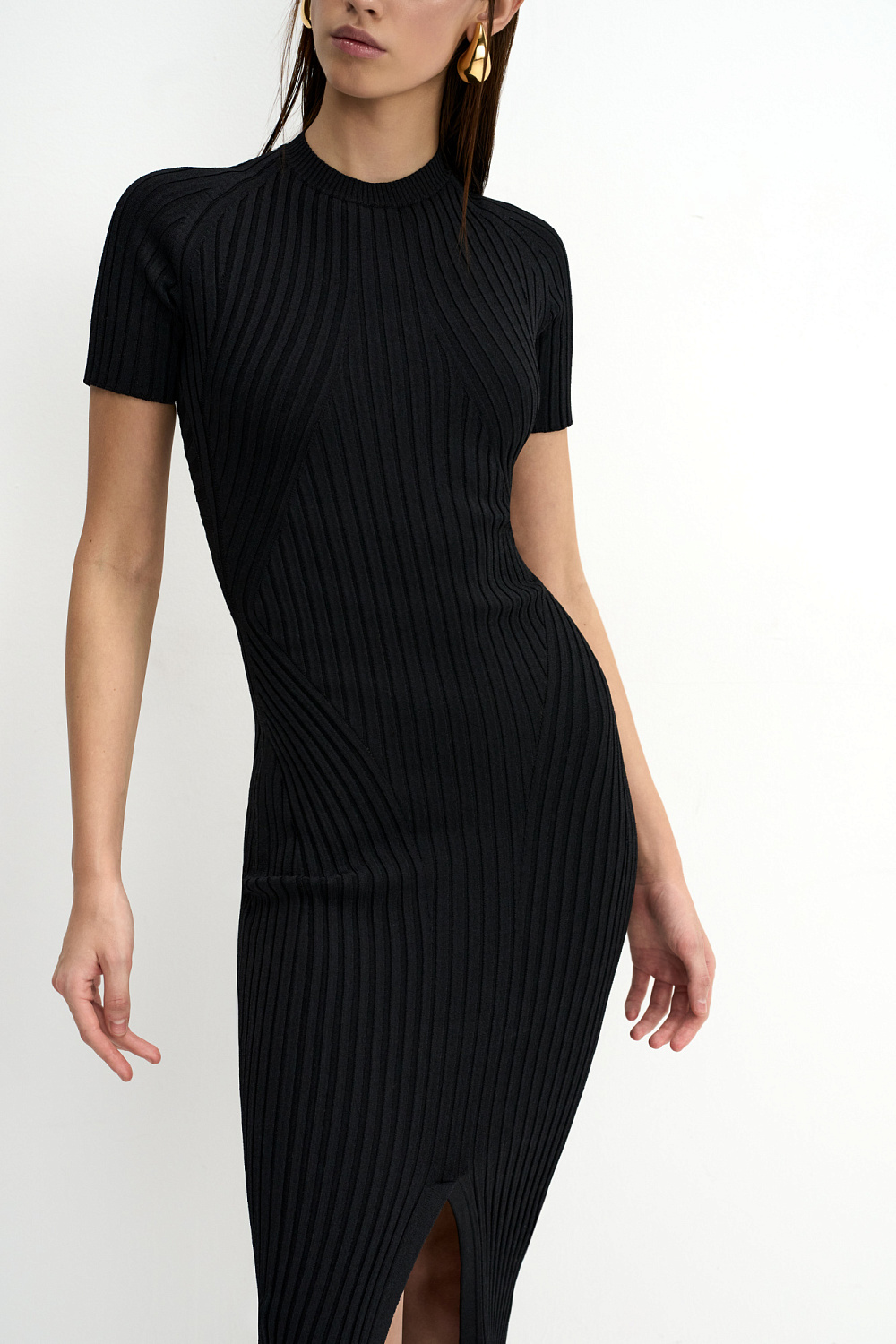Wide ribbed knitted dress with a twist at the back and a slit at the front.