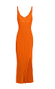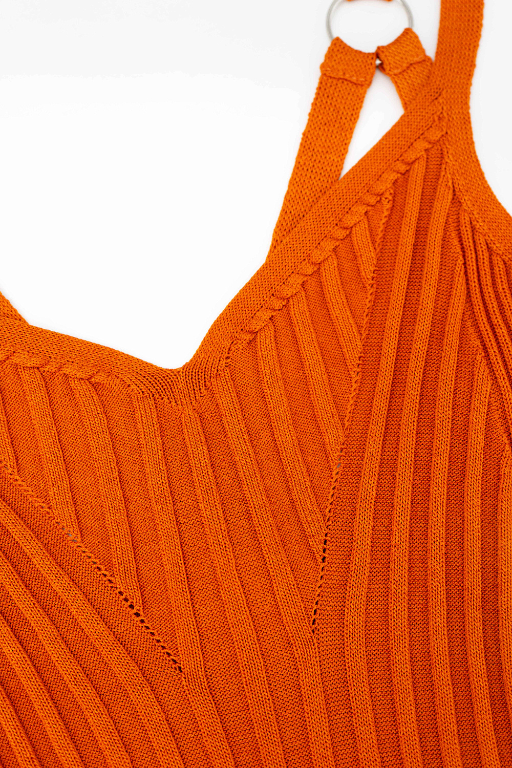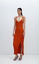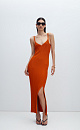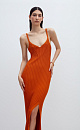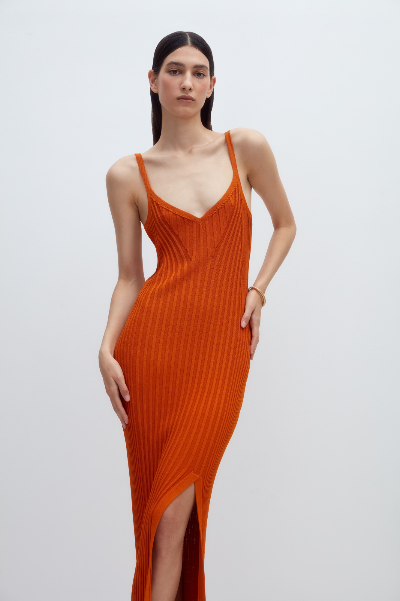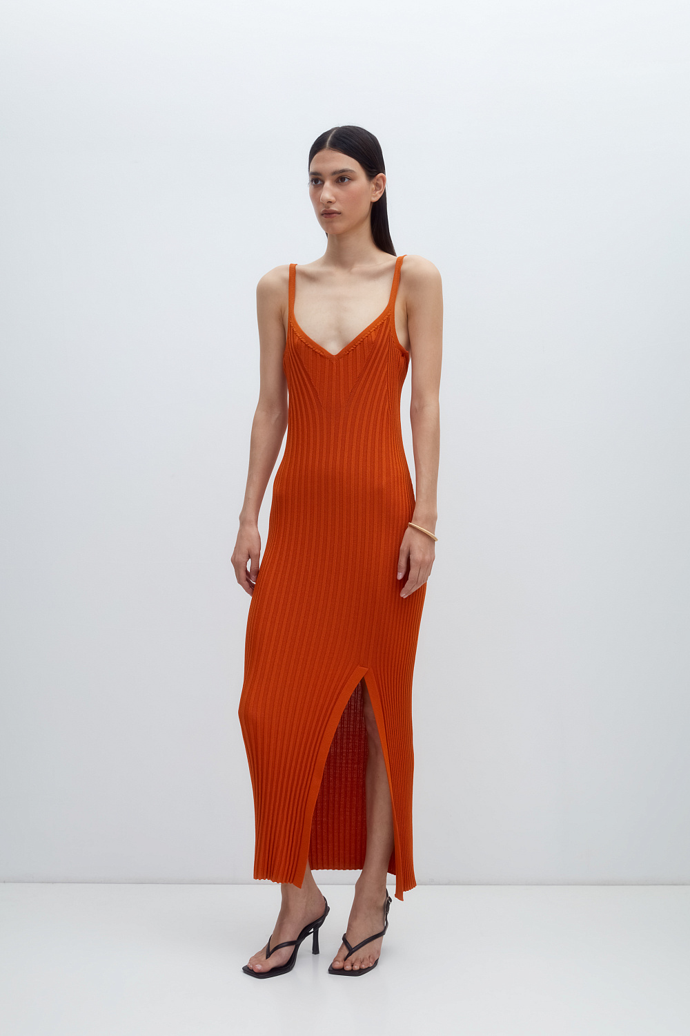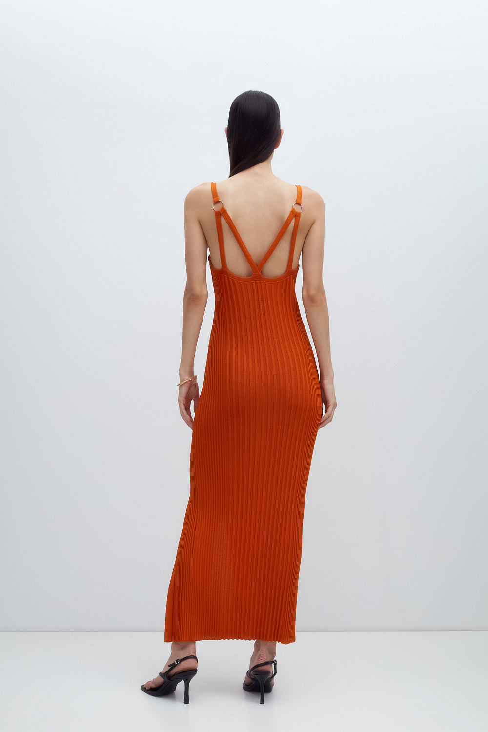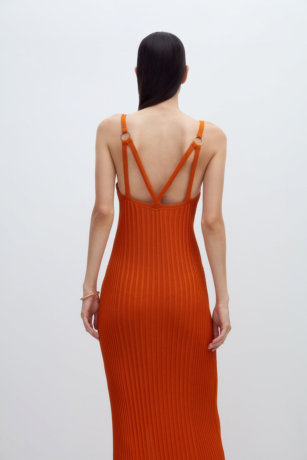Ribbed knit midi dress. Features fitted silhouette, side slit and cross straps at the back.