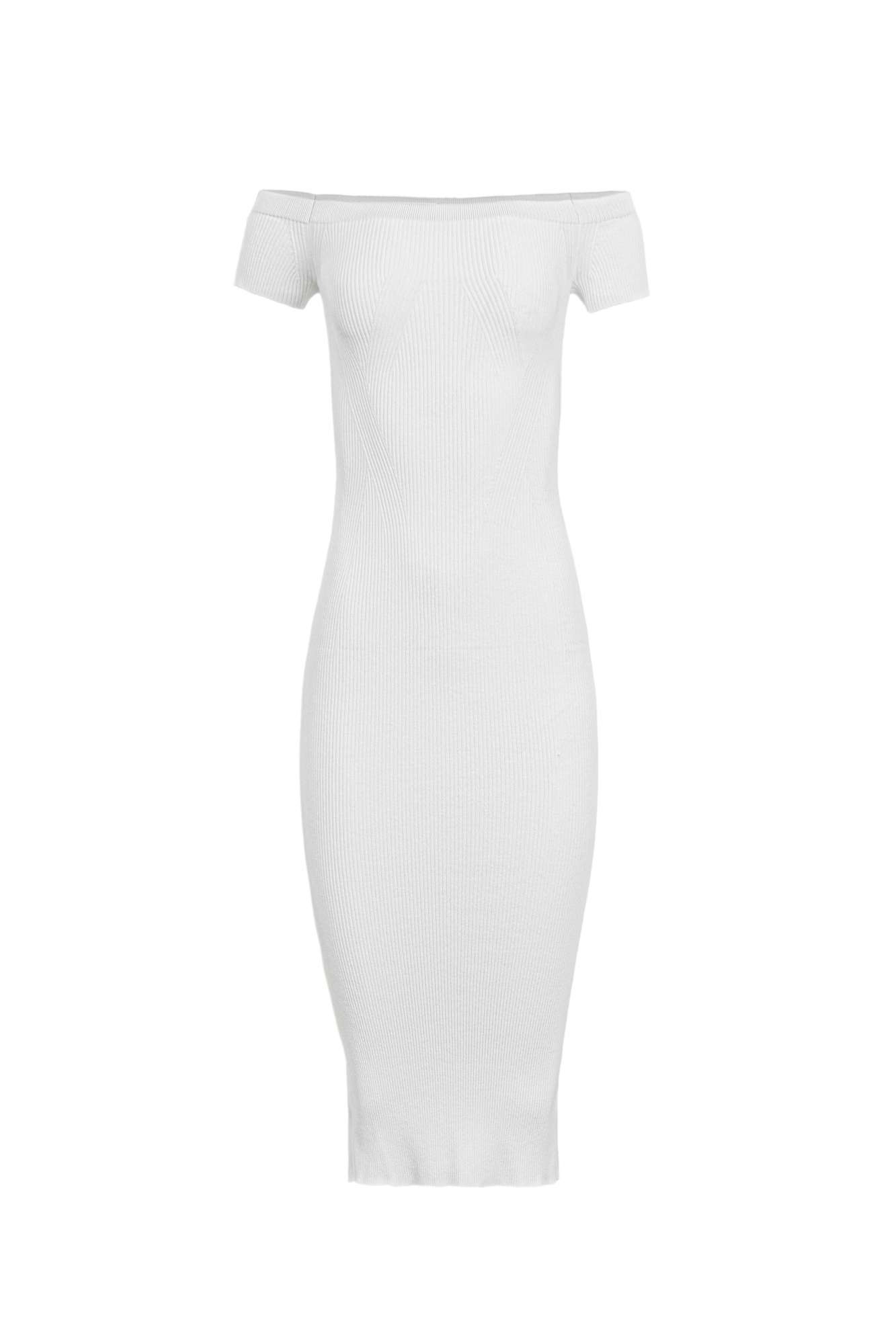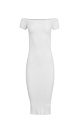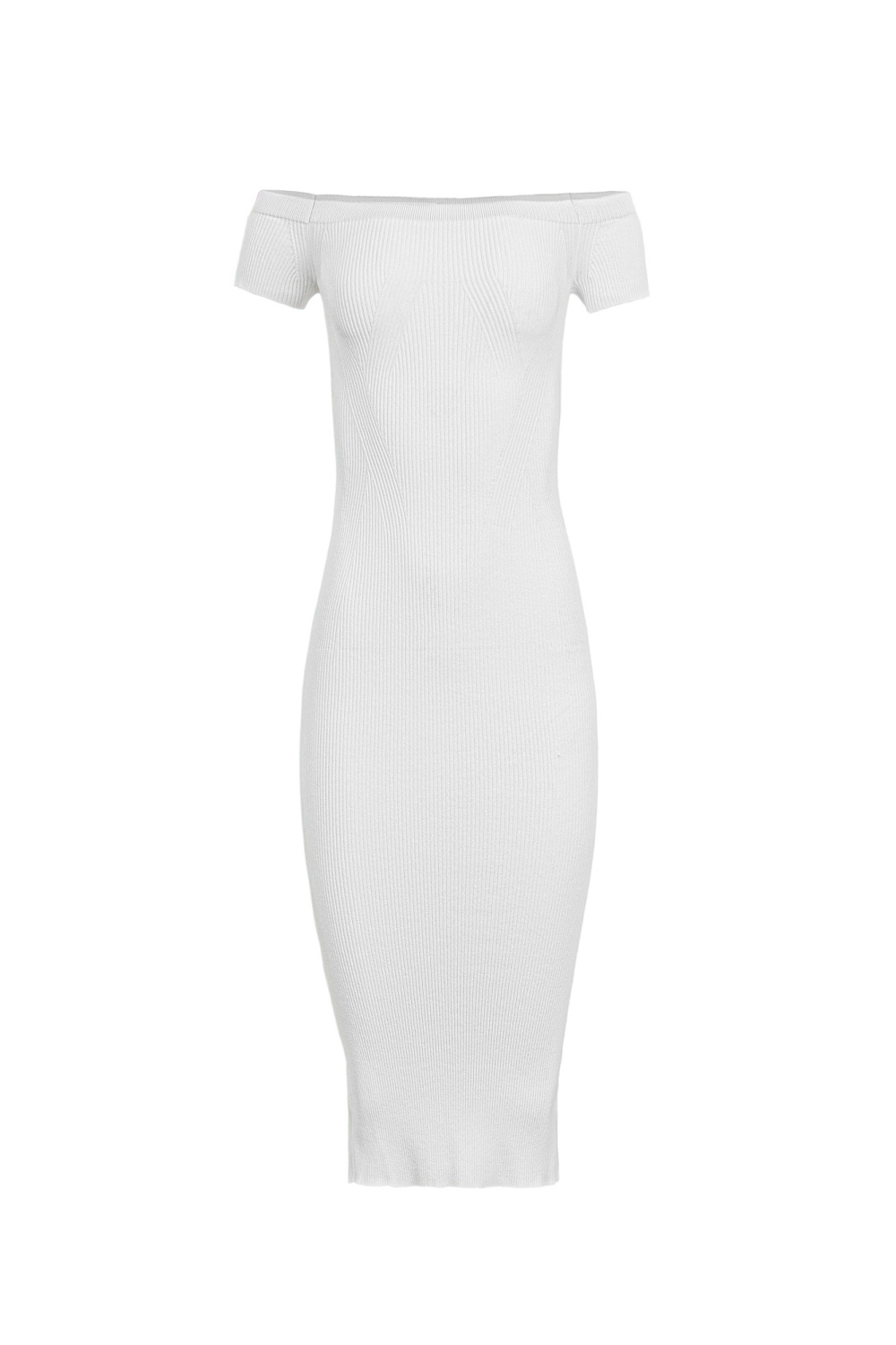 Viscose knit midi dress. Features fitted silhouette, open shoulders and back slit.