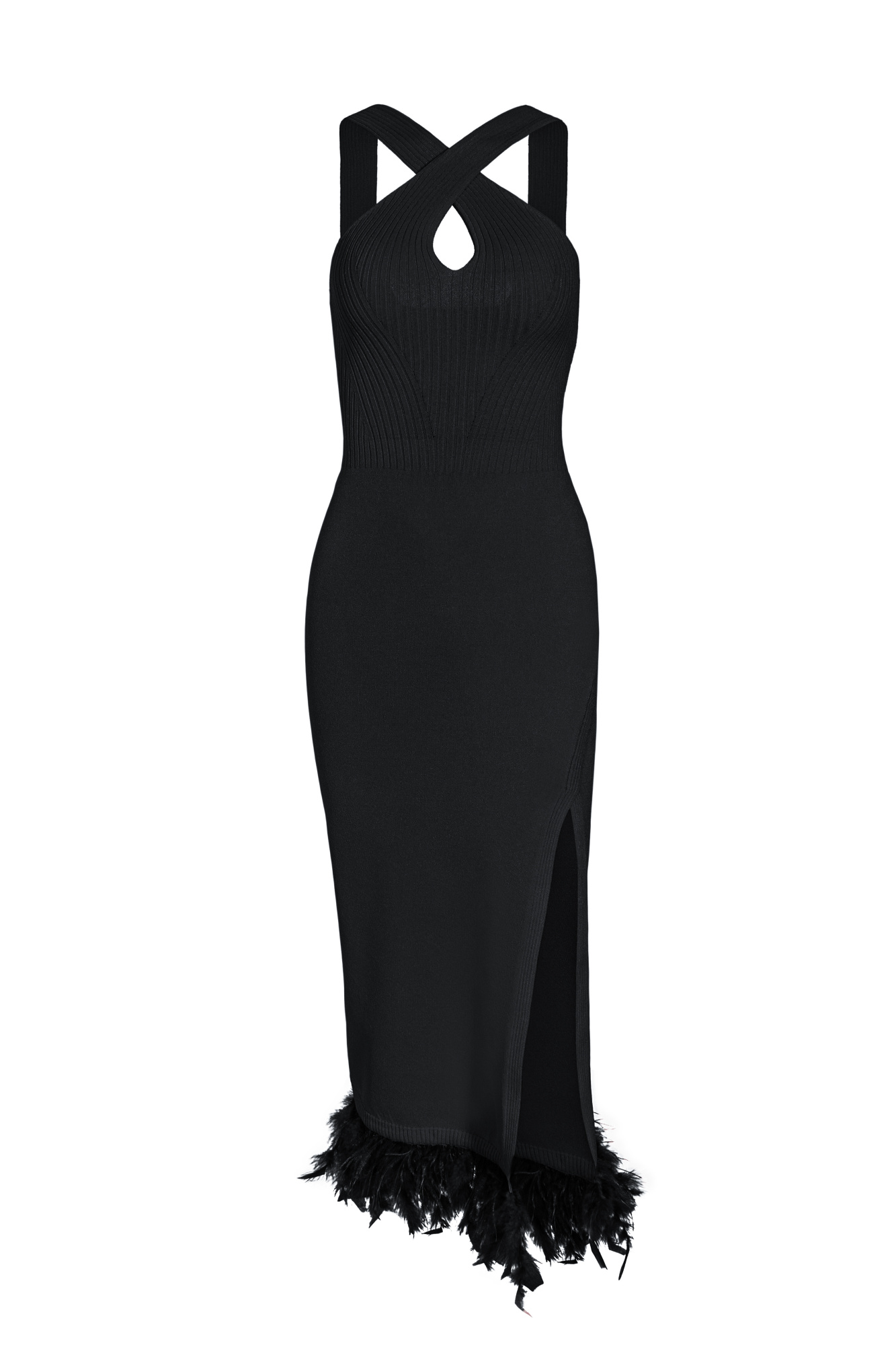 Fitted knit dress decorated with feathers. Features open back, twisted bodice and a side slit.