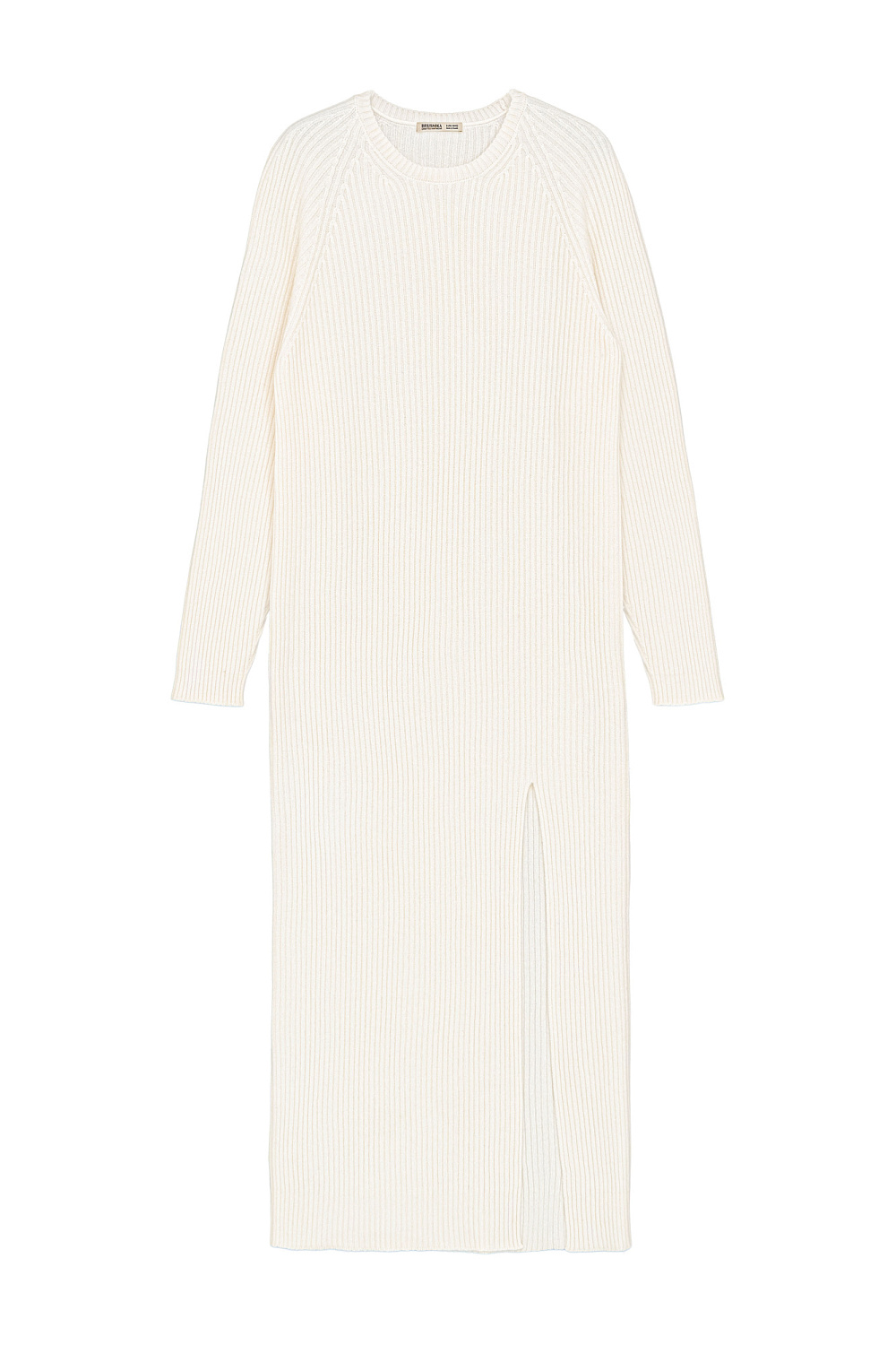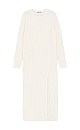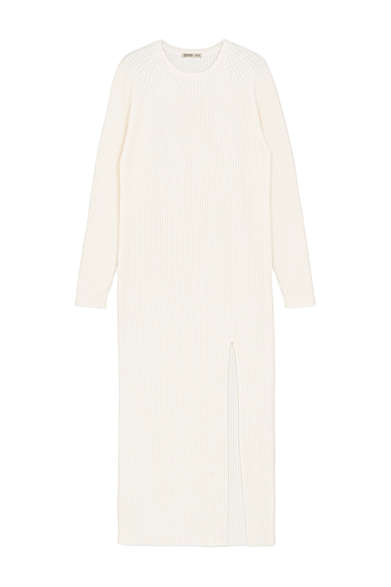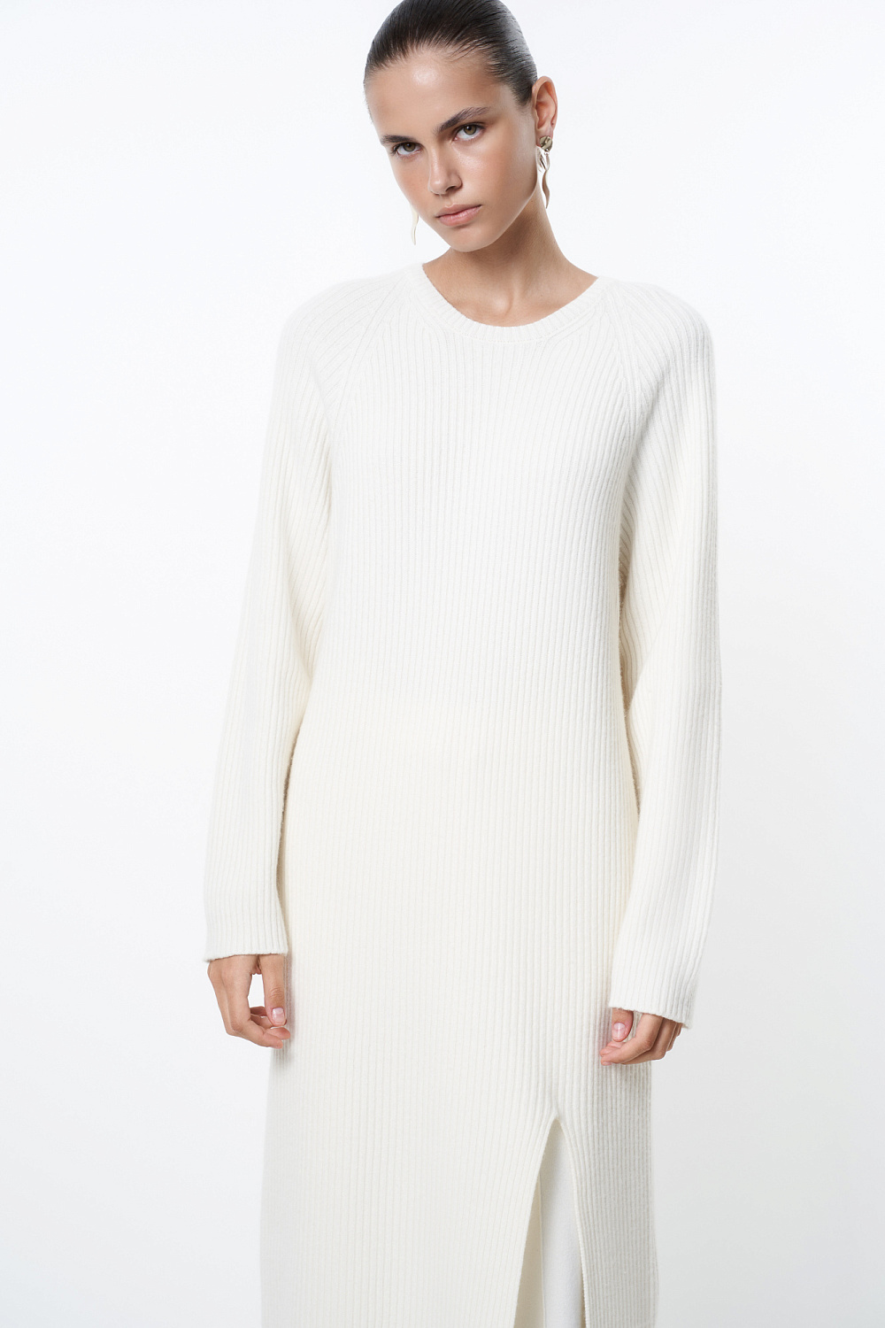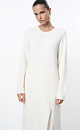 Knitted dress made of a wool blend with the addition of cashmere. Features loose silhouette with a wide rib with a front slit and dropped shoulder line.