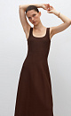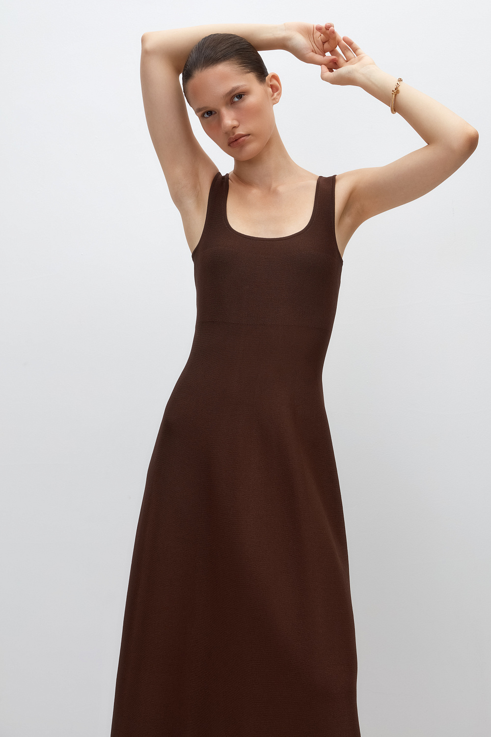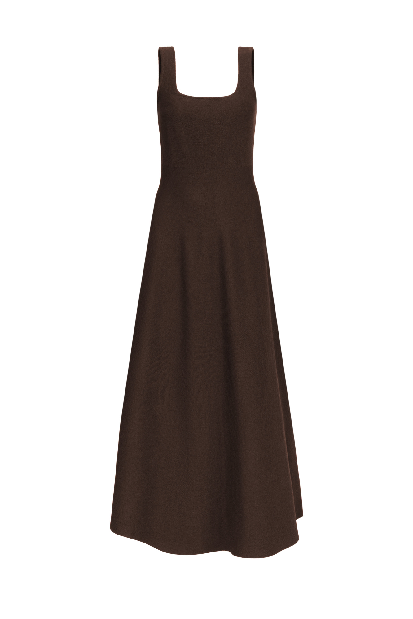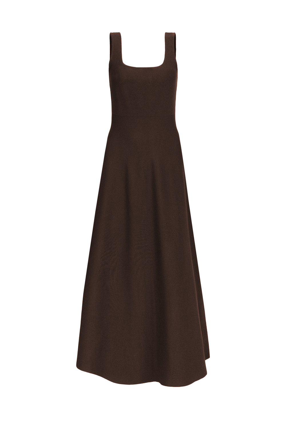 Thick knitted dress with straps and a flared midi skirt. Round neckline and back zip fastening.