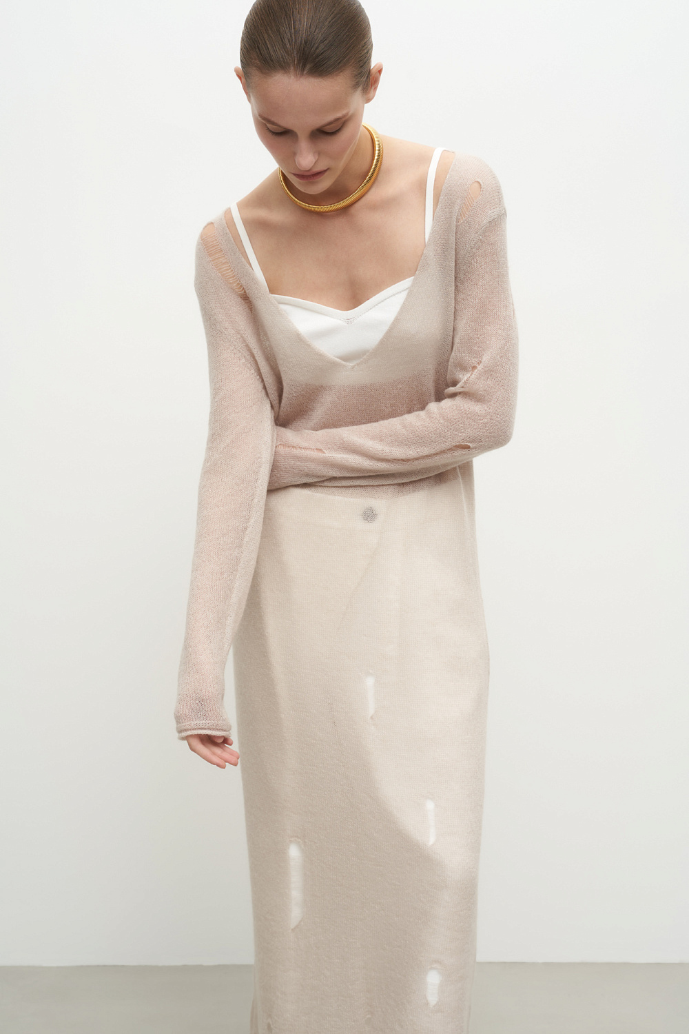 Grunge style knitted dress made of mixed yarn with the addition of mohair. V-neck.