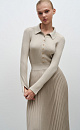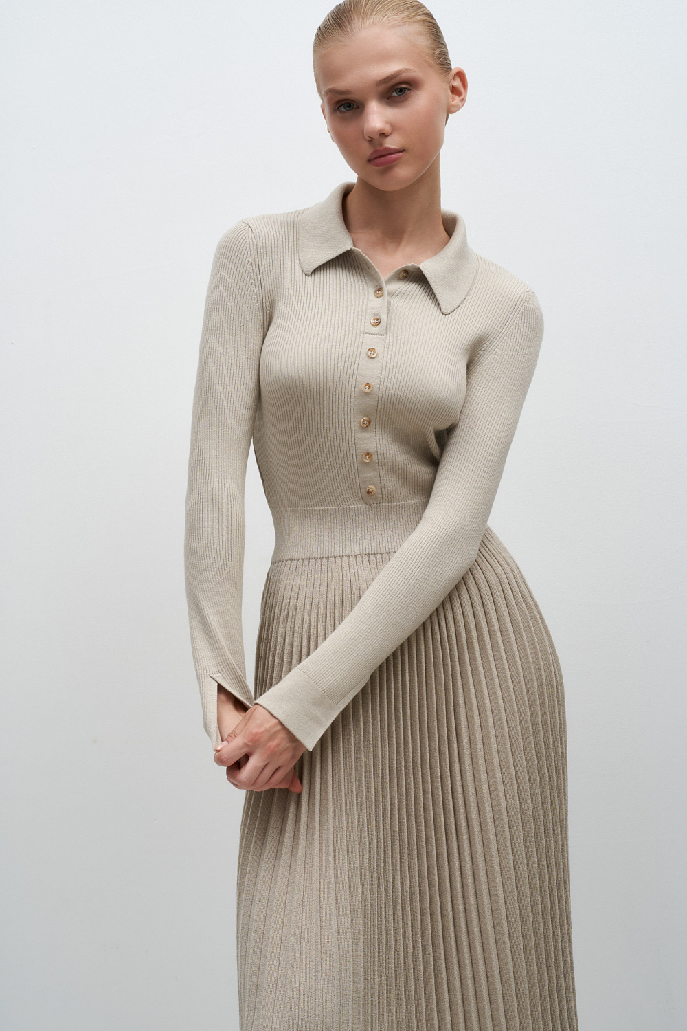 Knitted dress made of viscose and merino wool blend. Pleated midi skirt, turn-down polo collar and button placket at the chest. Long sleeves with slits.