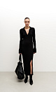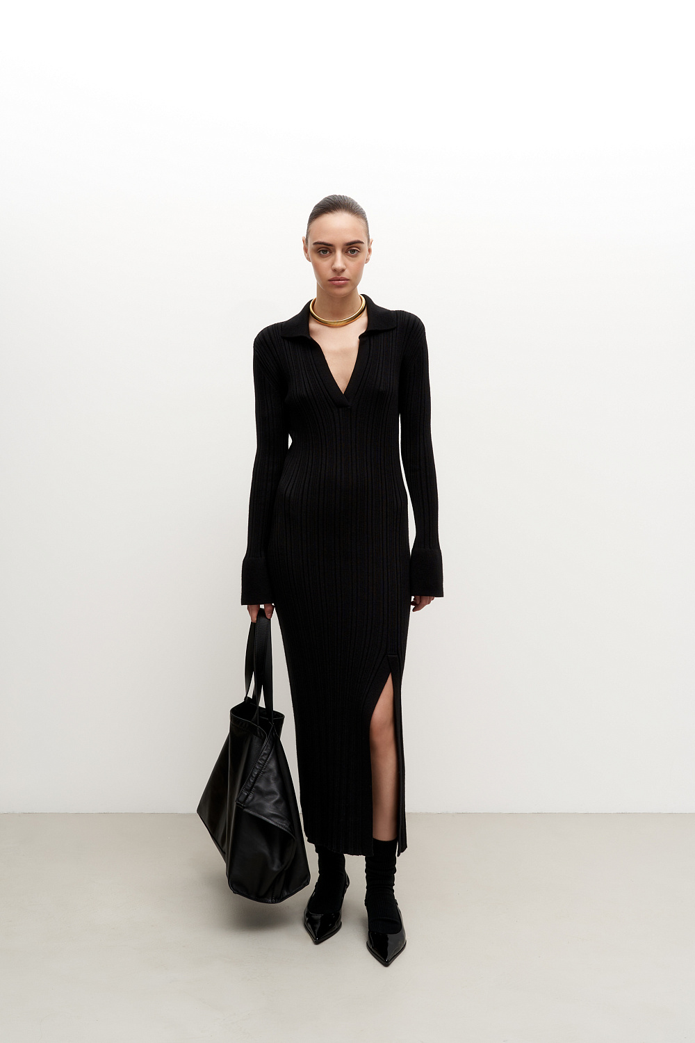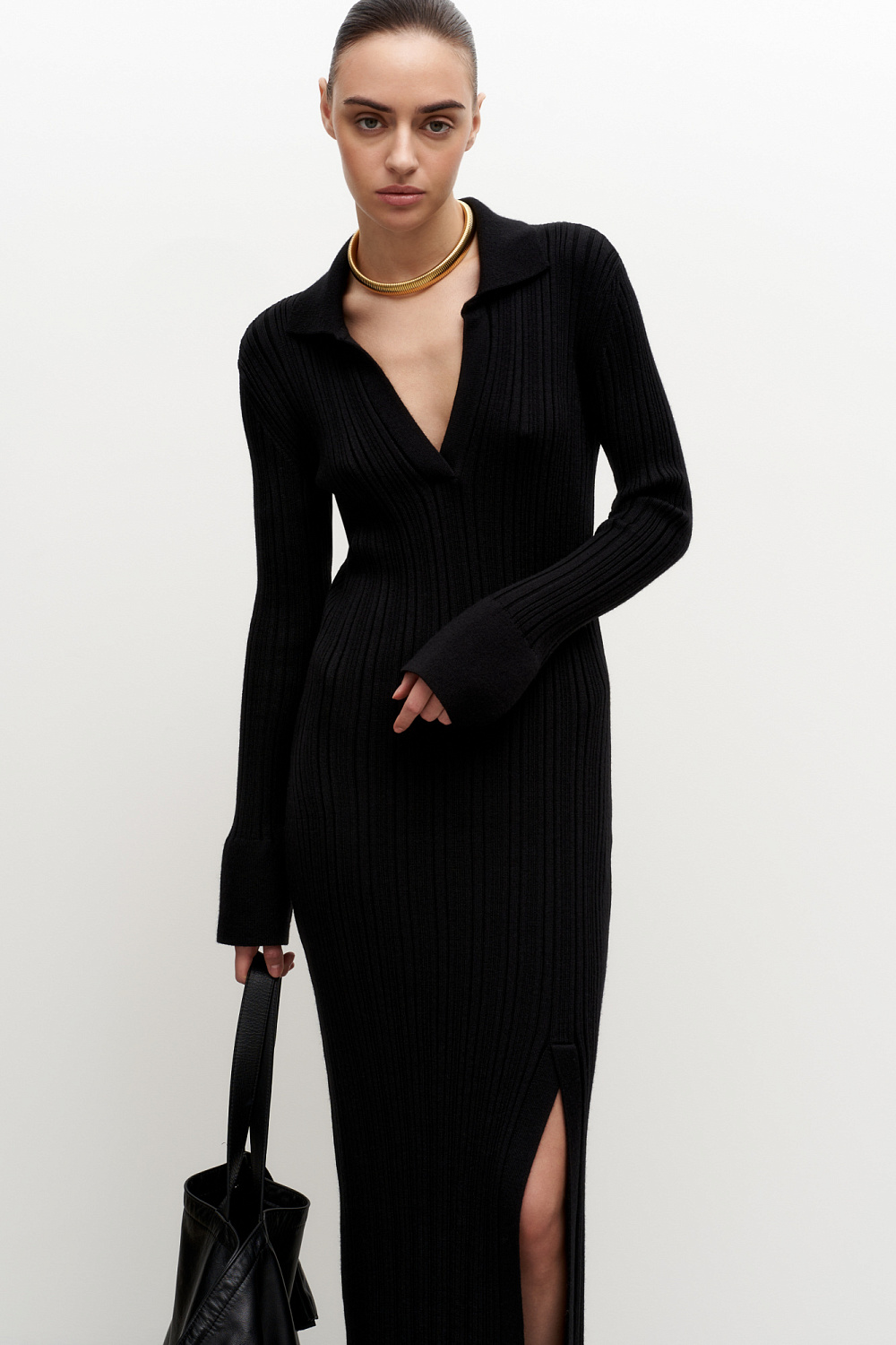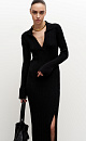 Wool blend knit midi dress. Fitted silhouette with a V-neck, polo collar and side slit.