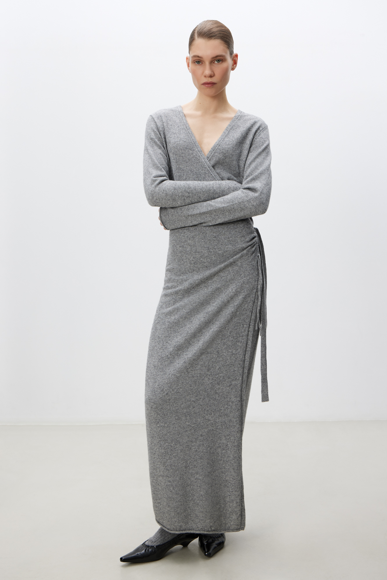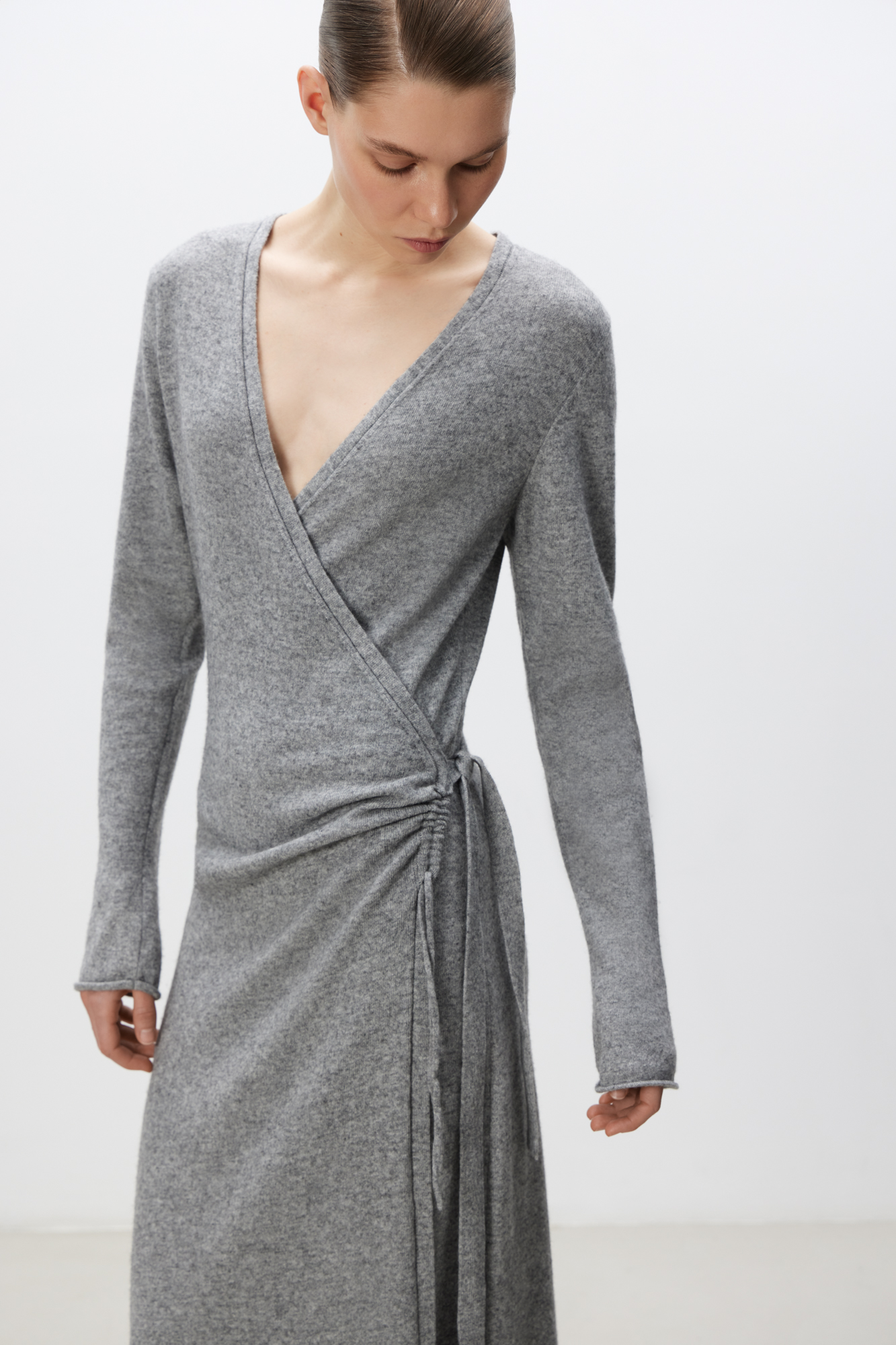 Knitted wrap wool dress with the addition of cashmere. Fitted silhouette with V-neck and drawstring.