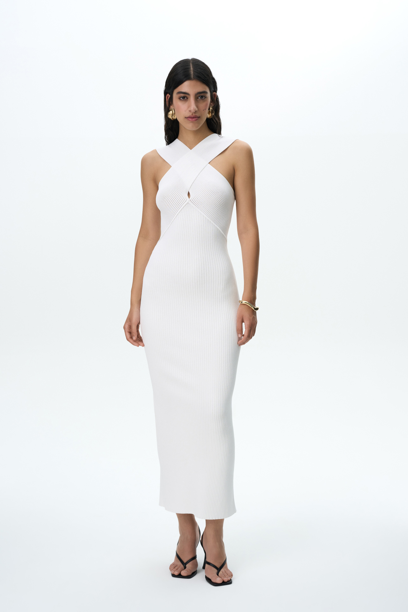 Fitted, ribbed knit dress with a criss-cross neckline and a small slit at the back.