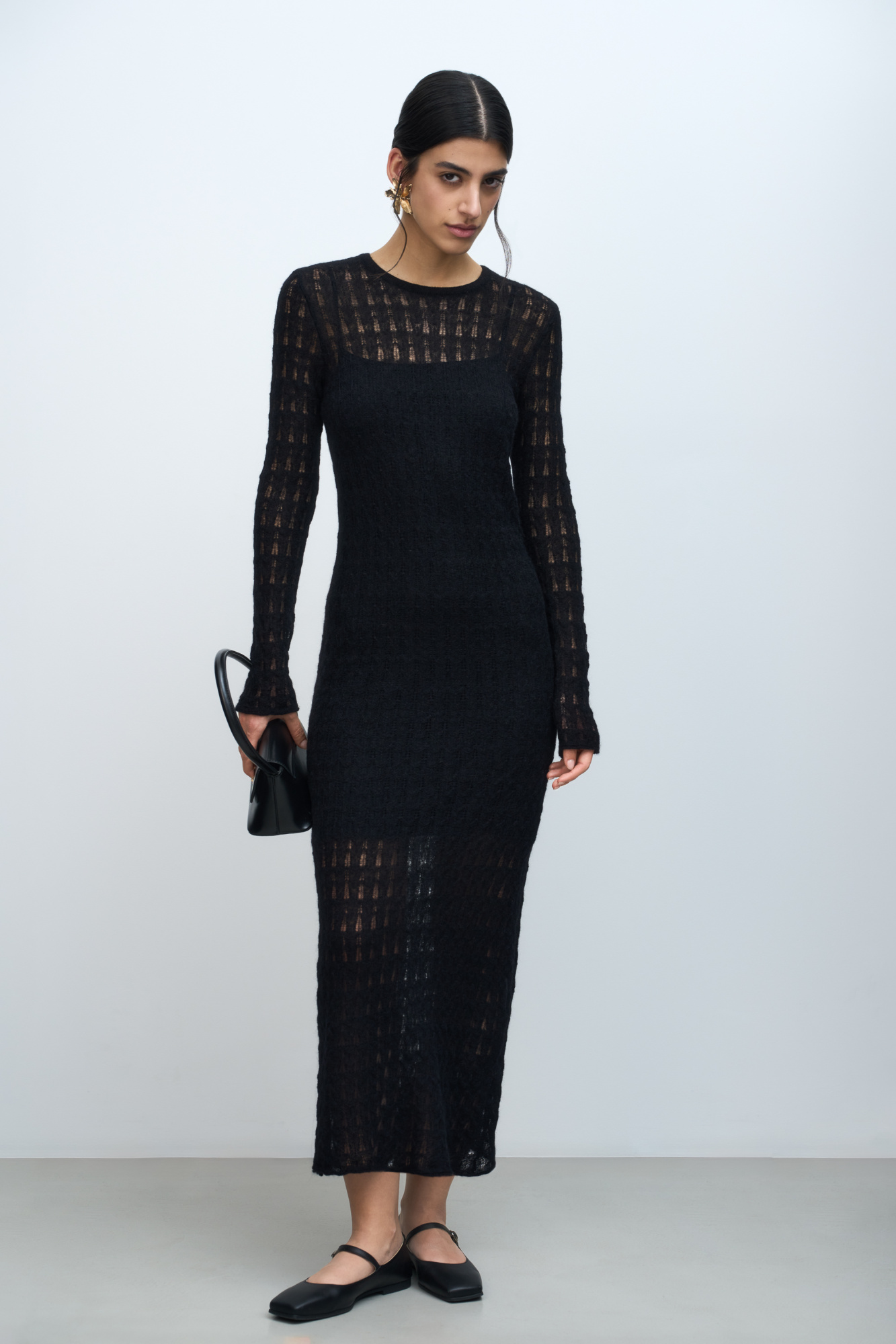 Knitted openwork dress. The model has a straight silhouette and is made from the finest yarn - a mixture of superkid mohair. Includes underslip dress.