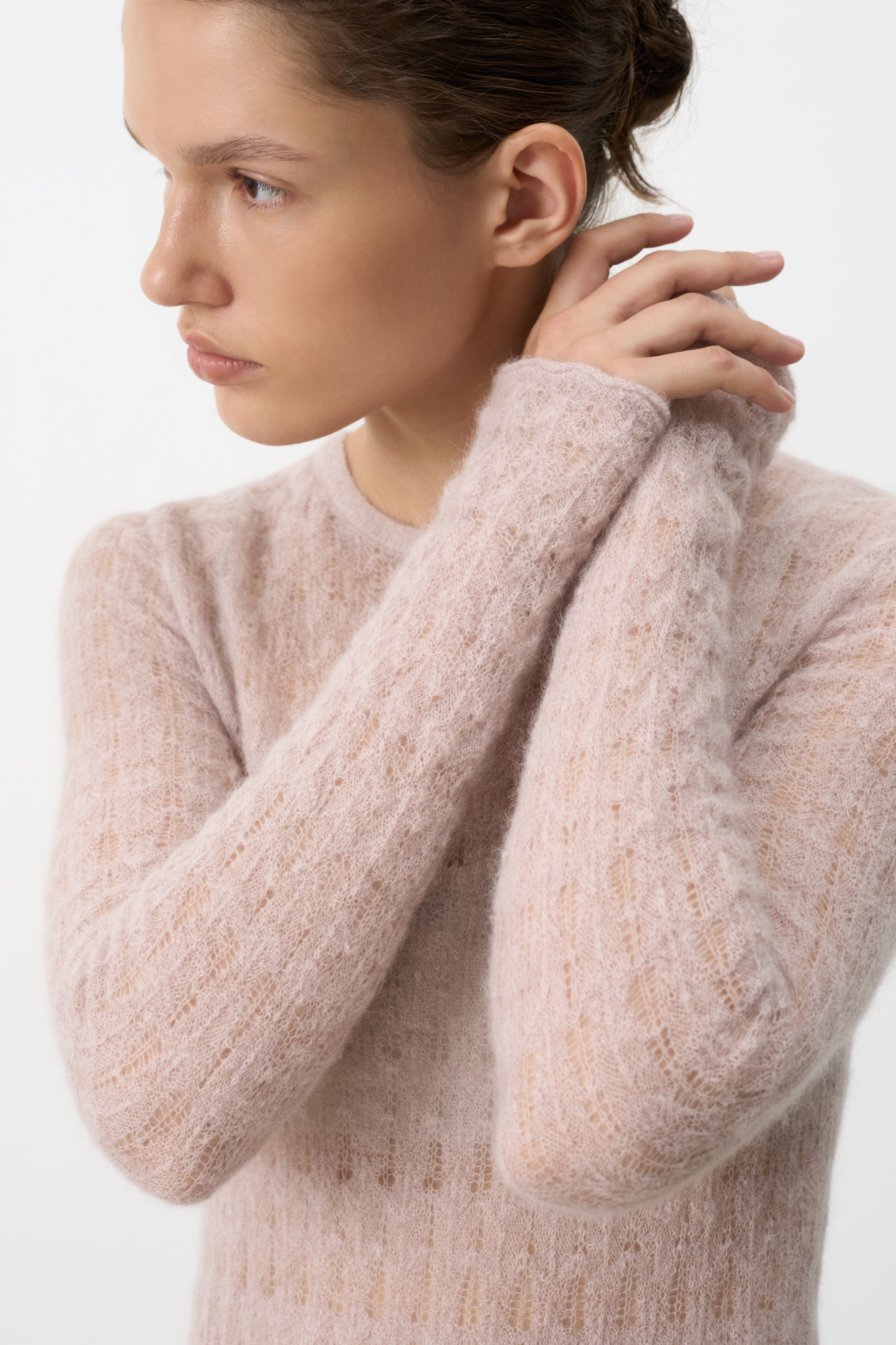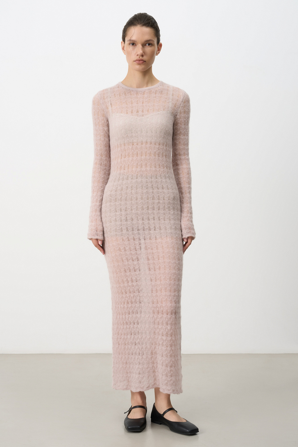 Knitted openwork dress. The model has a straight silhouette and is made from the finest yarn - a mixture of superkid mohair. Includes underslip dress.