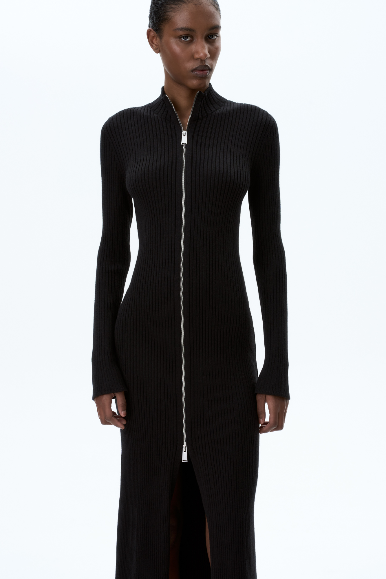 Wool blend knitted dress. Fitted midi dress with a high front slit and zip fastening.