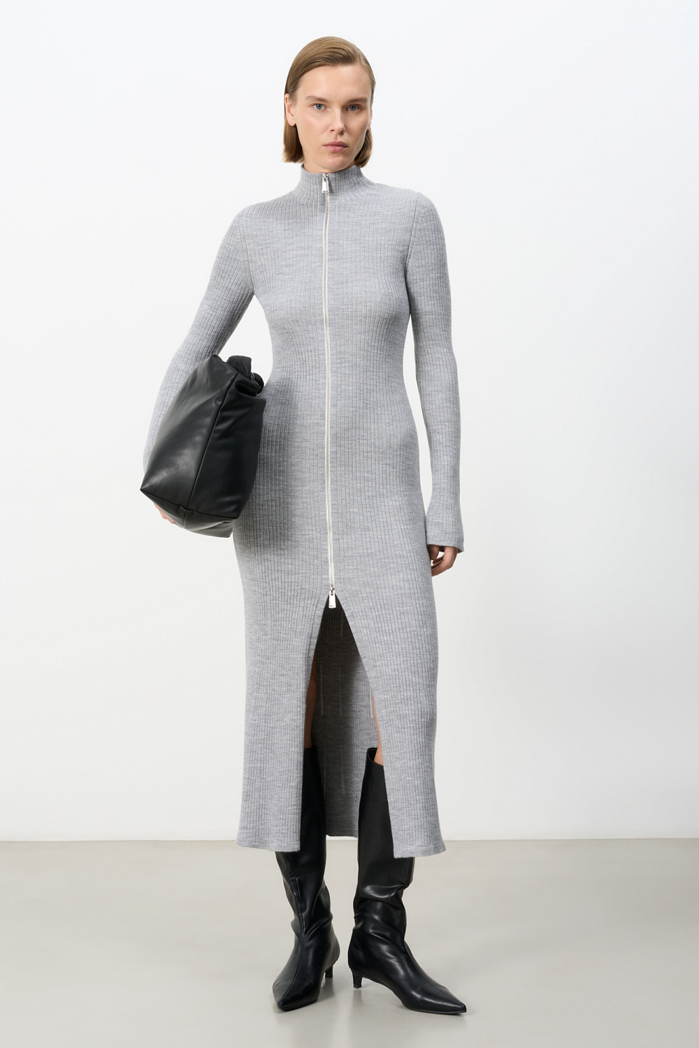 Wool blend knitted dress. Fitted midi dress with a high front slit and zip fastening.