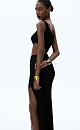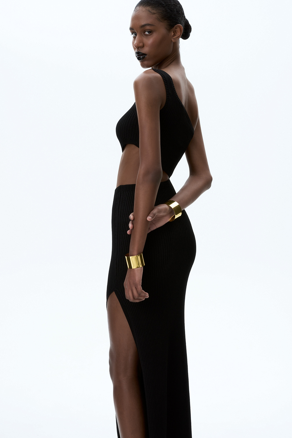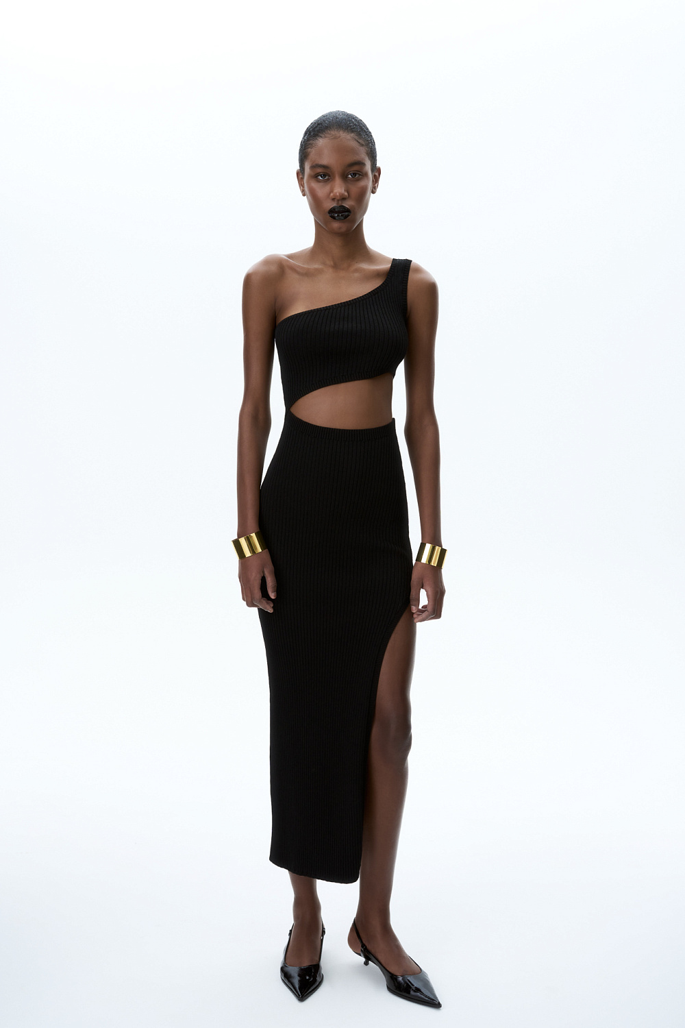One-shoulder midi dress. Fitted silhouette with a slit at the side and a cutout at the waist.