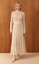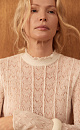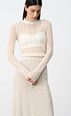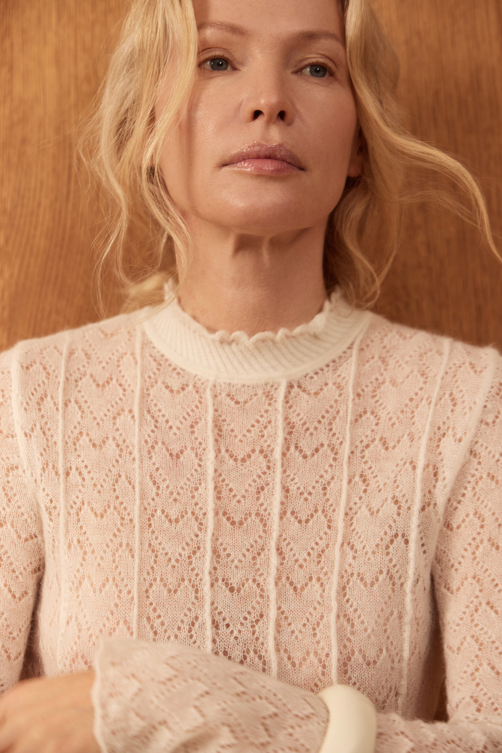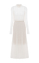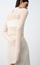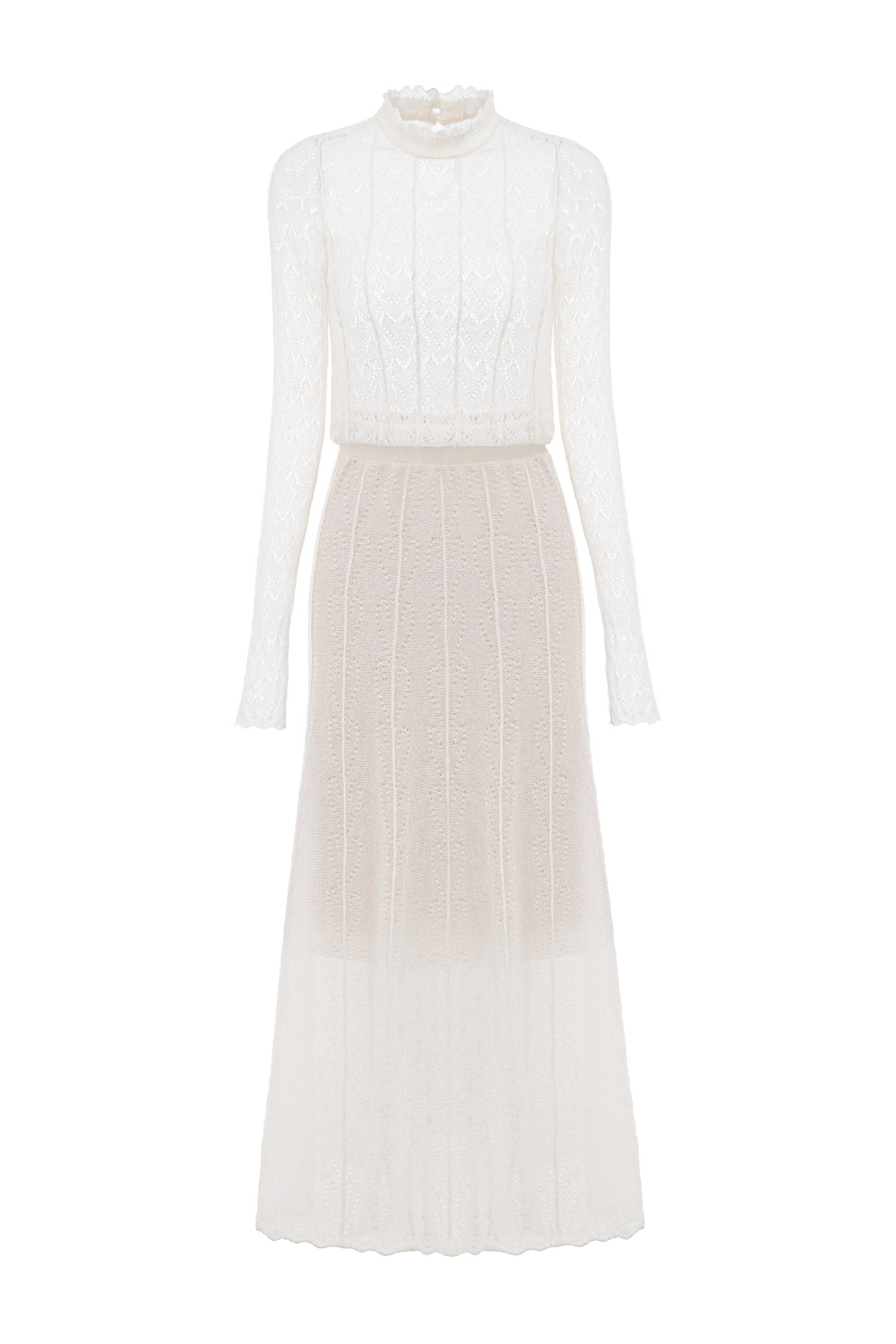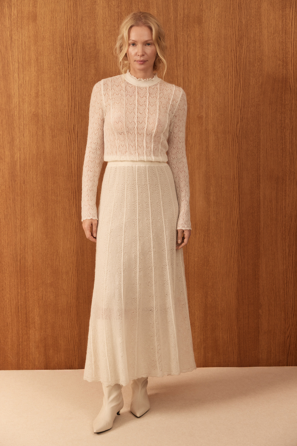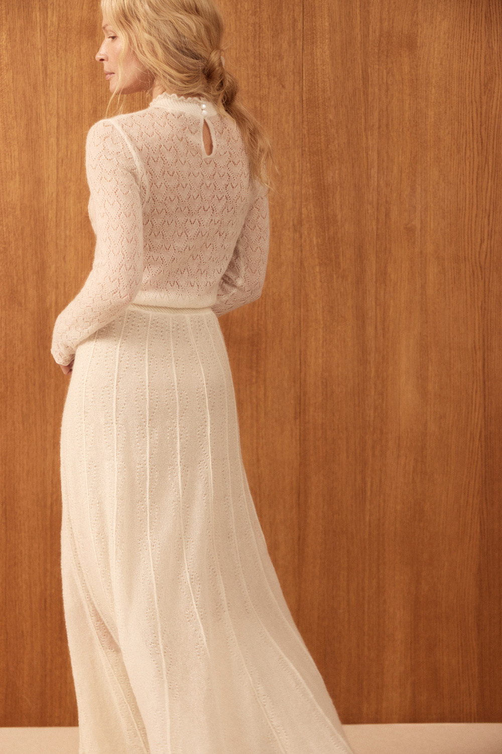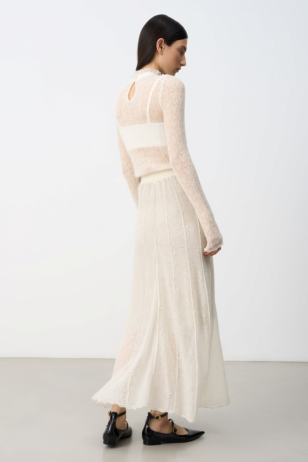 Knitted midi dress made in semi-sheer lace with a petticoat. Long sleeves, a small gathered collar, a button fastening at the back and an elasticated waistband. The dress is made of soft kid mohair and baby alpaca yarn, which will make you feel comfortable and warm in it.