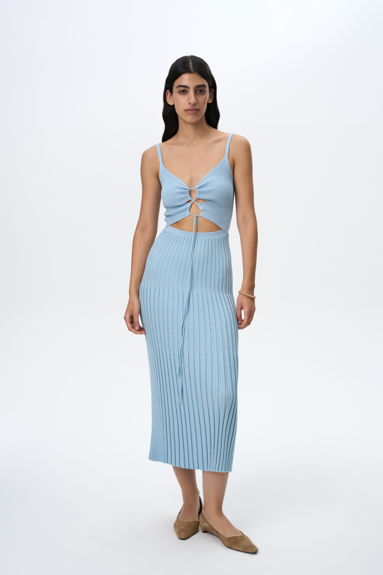 Knitted sundress with a pleated skirt, thin straps and a textured bodice with drawstring