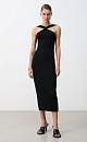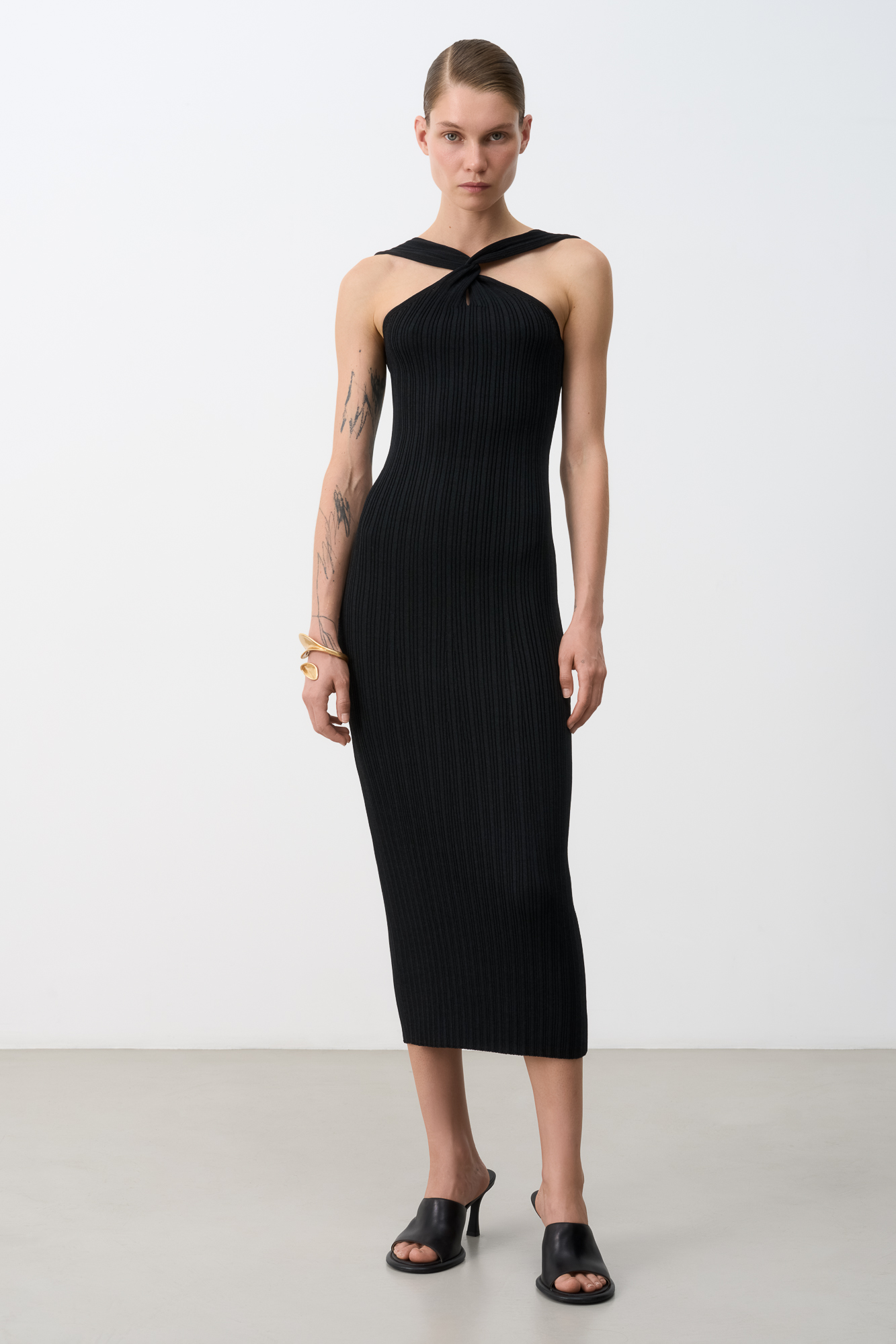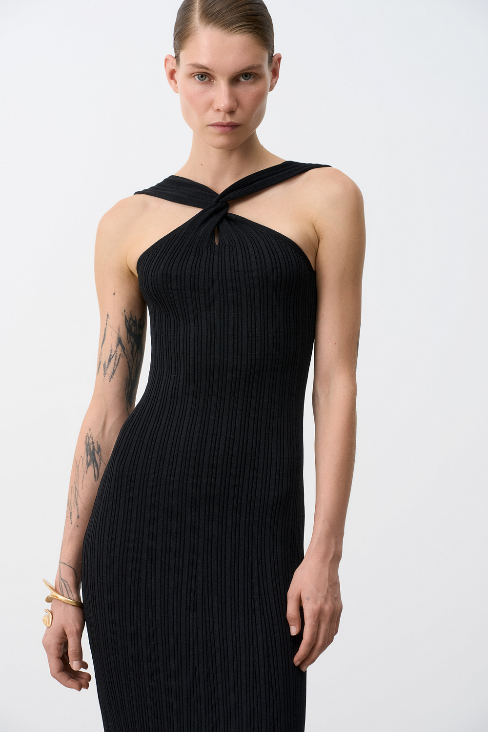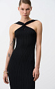 Fitted knit midi dress with double twist at the chest and open shoulders