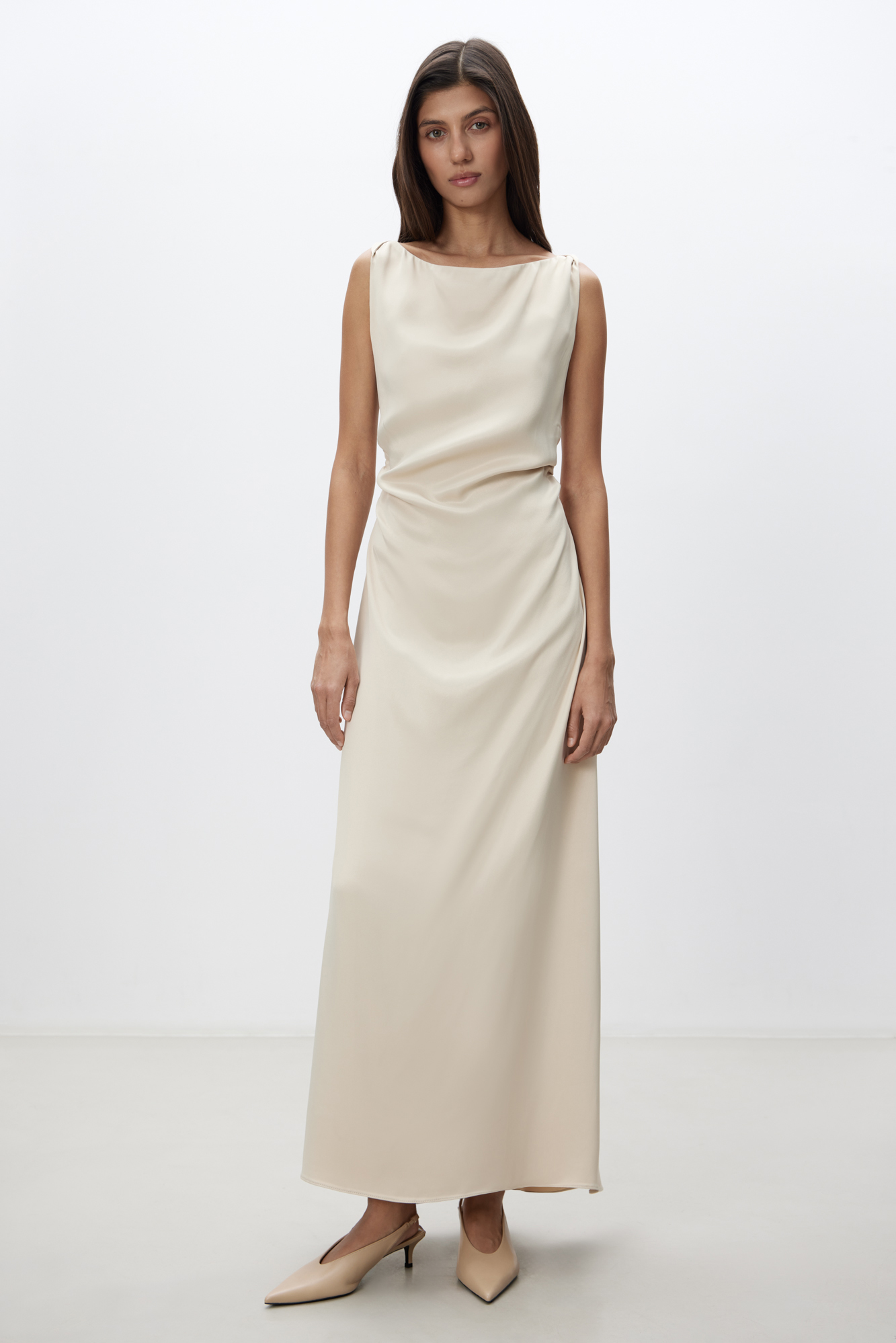 Satin midi length dress made of 100% viscose. The model has a fitted silhouette, sleeveless, with twist at the shoulders and drapery. Zip fastening at the back.