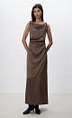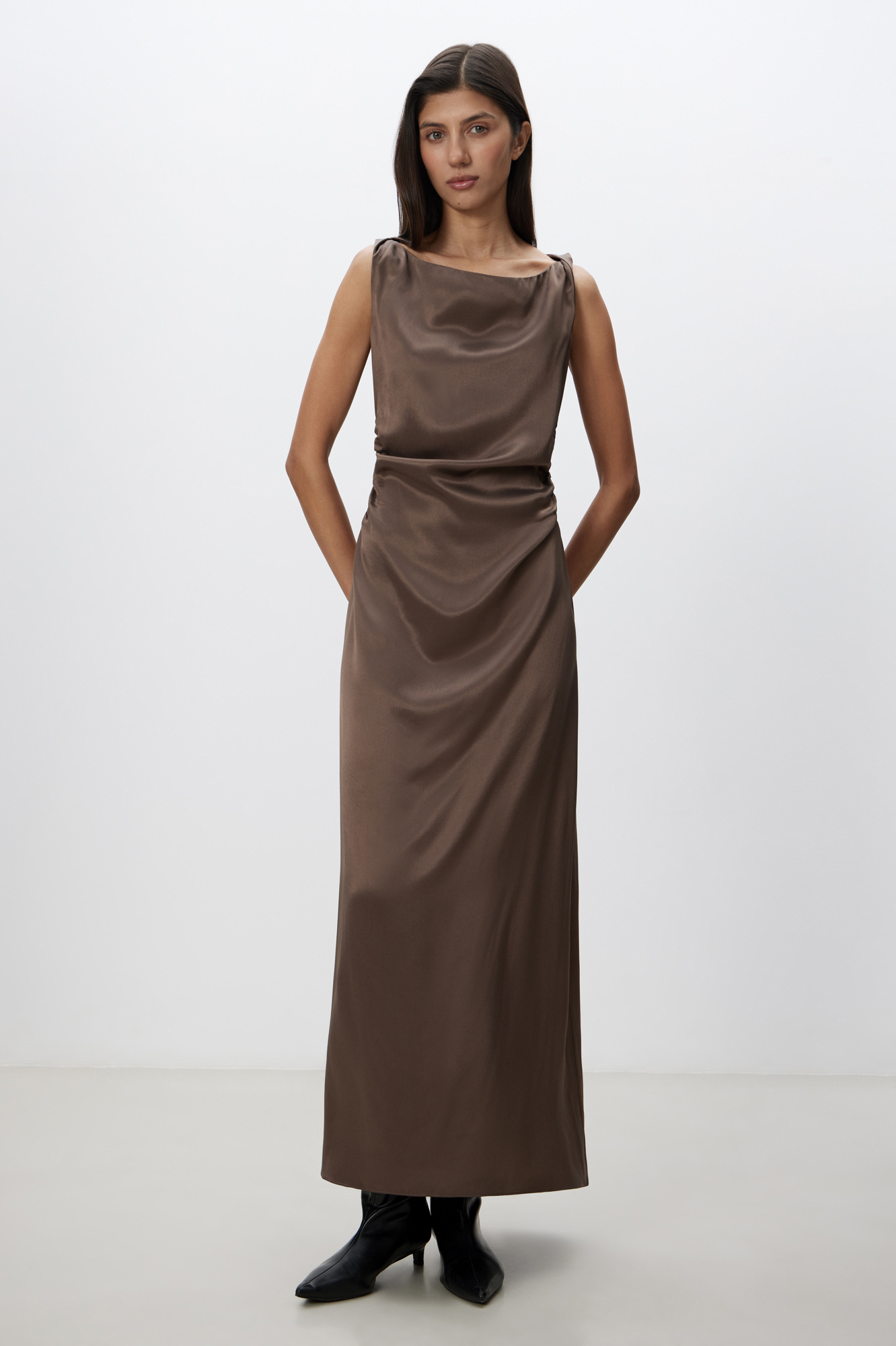 Satin midi length dress made of 100% viscose. The model has a fitted silhouette, sleeveless, with twist at the shoulders and drapery. Zip fastening at the back.