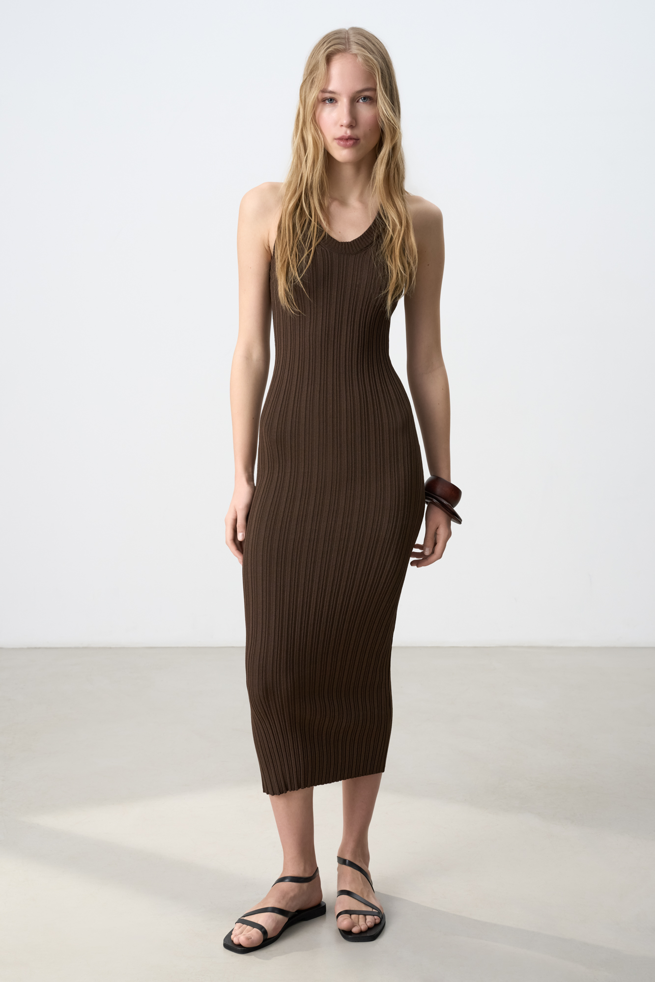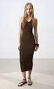 Knitted midi dress made of fine viscose. The model has a fitted silhouette, sleeveless, with a deep armhole and U-neck. The product is made with a wide rib.