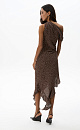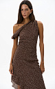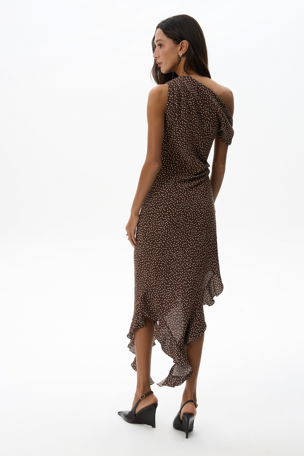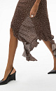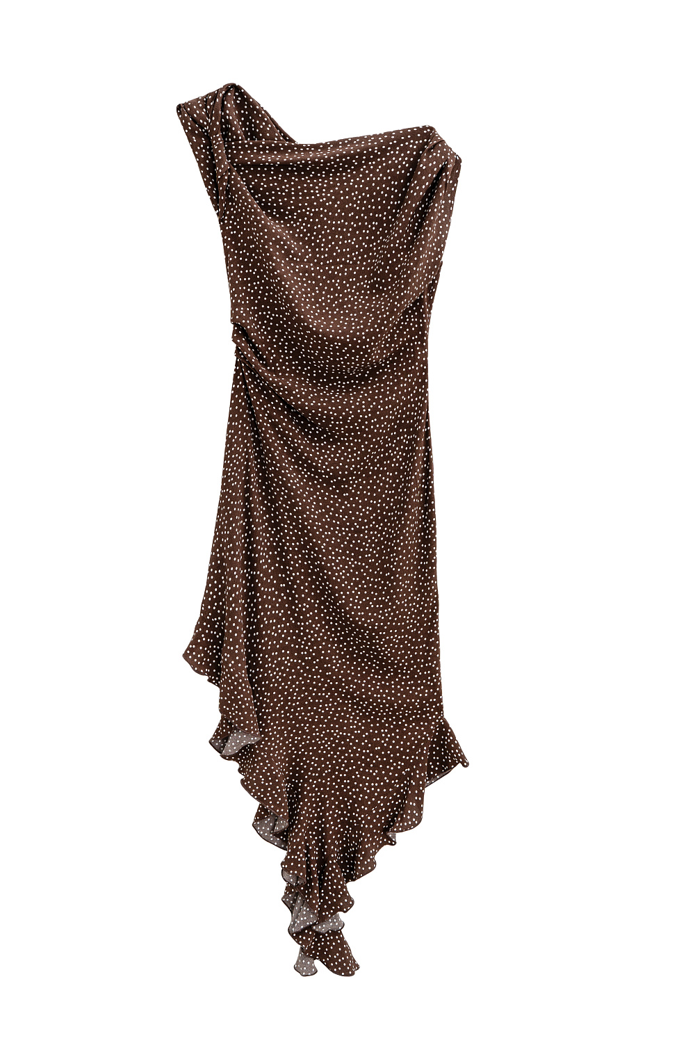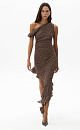 This printed midi dress, crafted from 100% crepe viscose, features a straight, sleeveless silhouette, wide, twisted straps, an asymmetrical skirt, ruffles, and a draped waist.