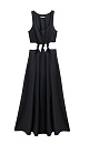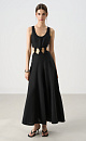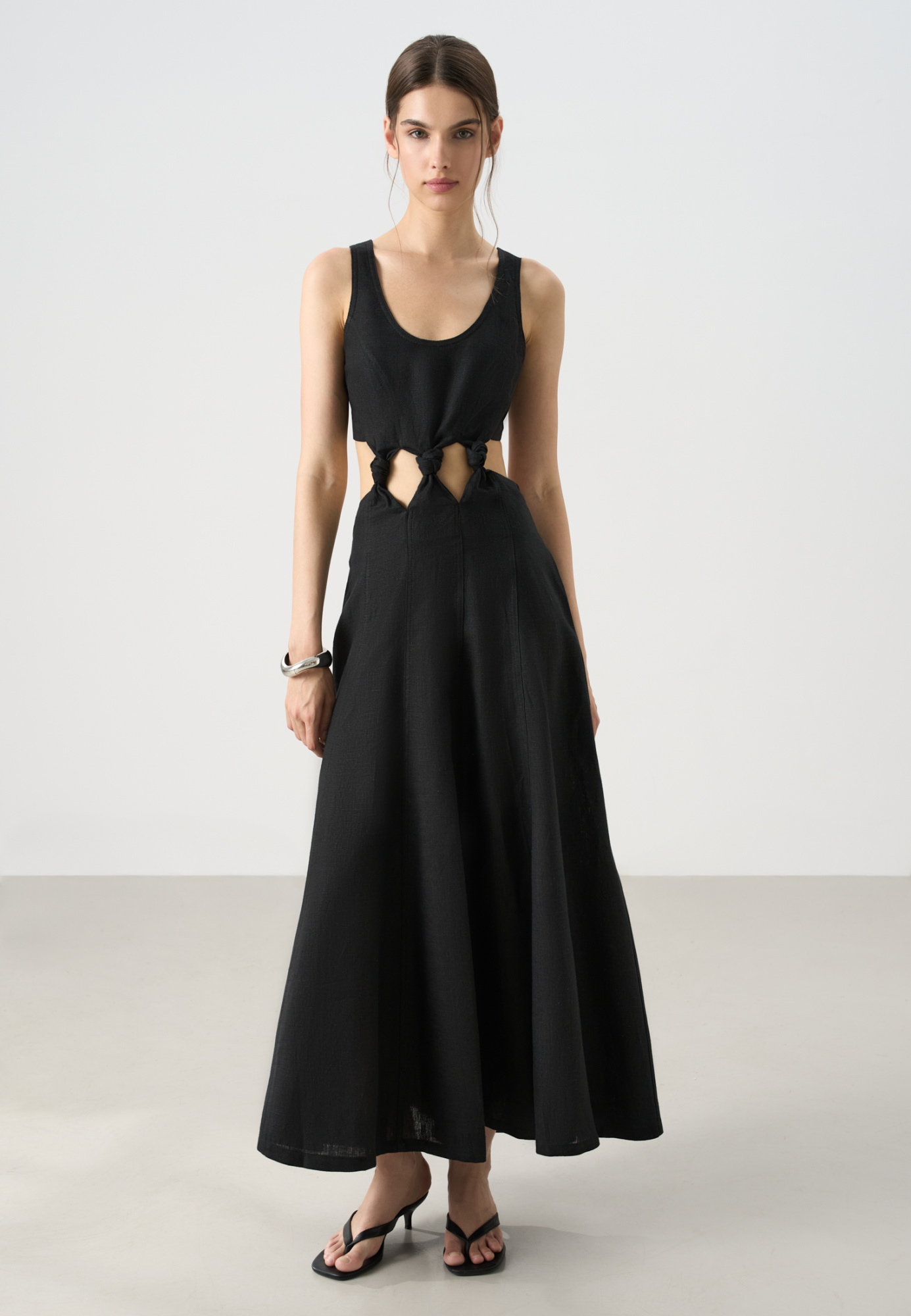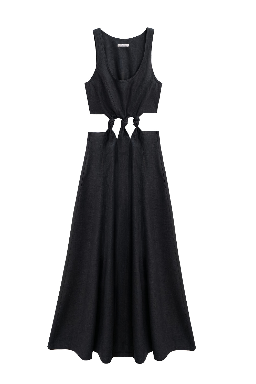 Midi length dress made of 100% linen. The model has a fitted silhouette with a flared skirt, sleeveless, wide straps and a U-neck. The product is decorated with vertical seams and voluminous knots at the waist.