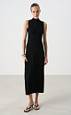 A maxi-length knit viscose dress. It features a fitted, sleeveless silhouette, a low stand-up collar, and a pleated skirt that falls below the hips.