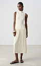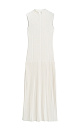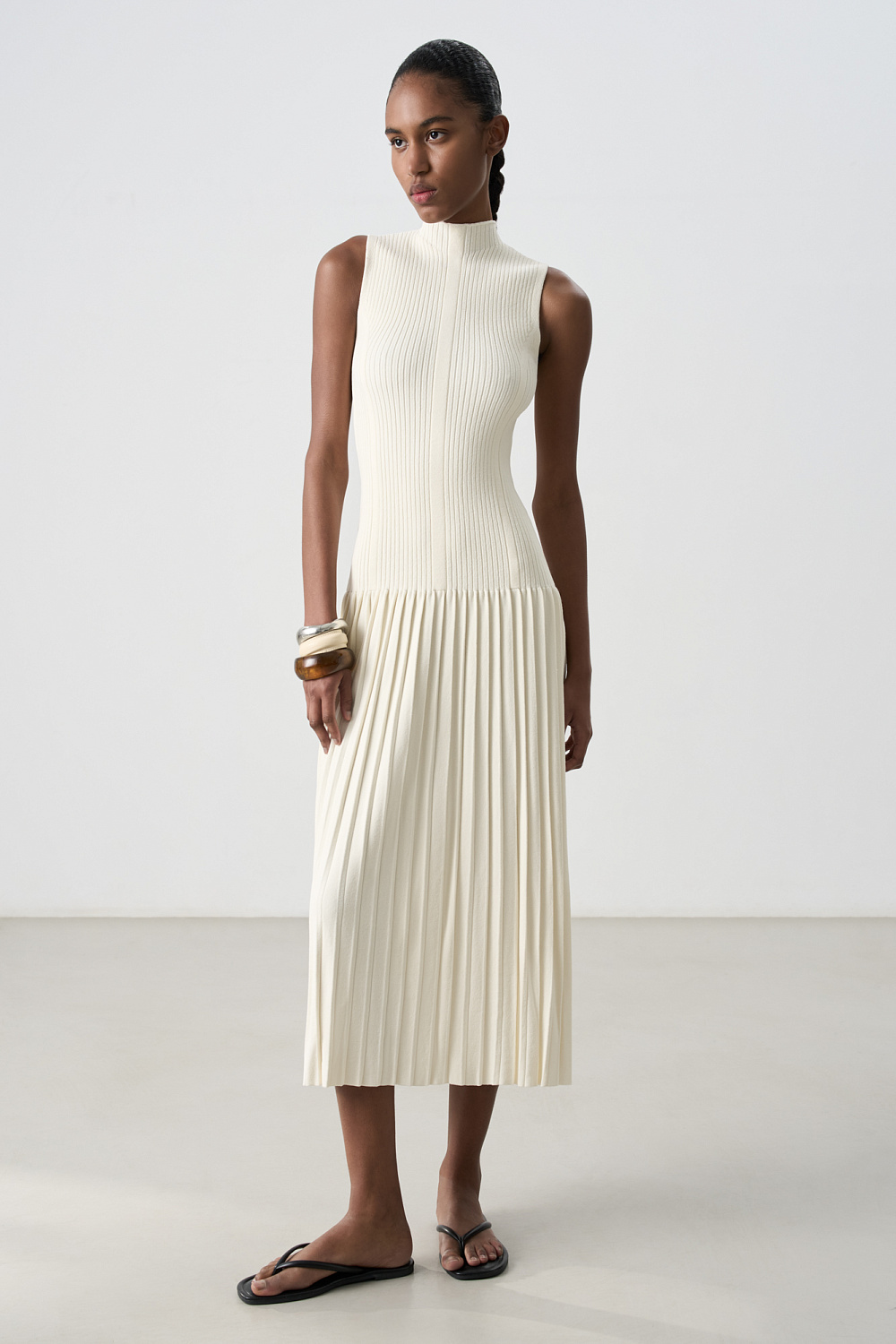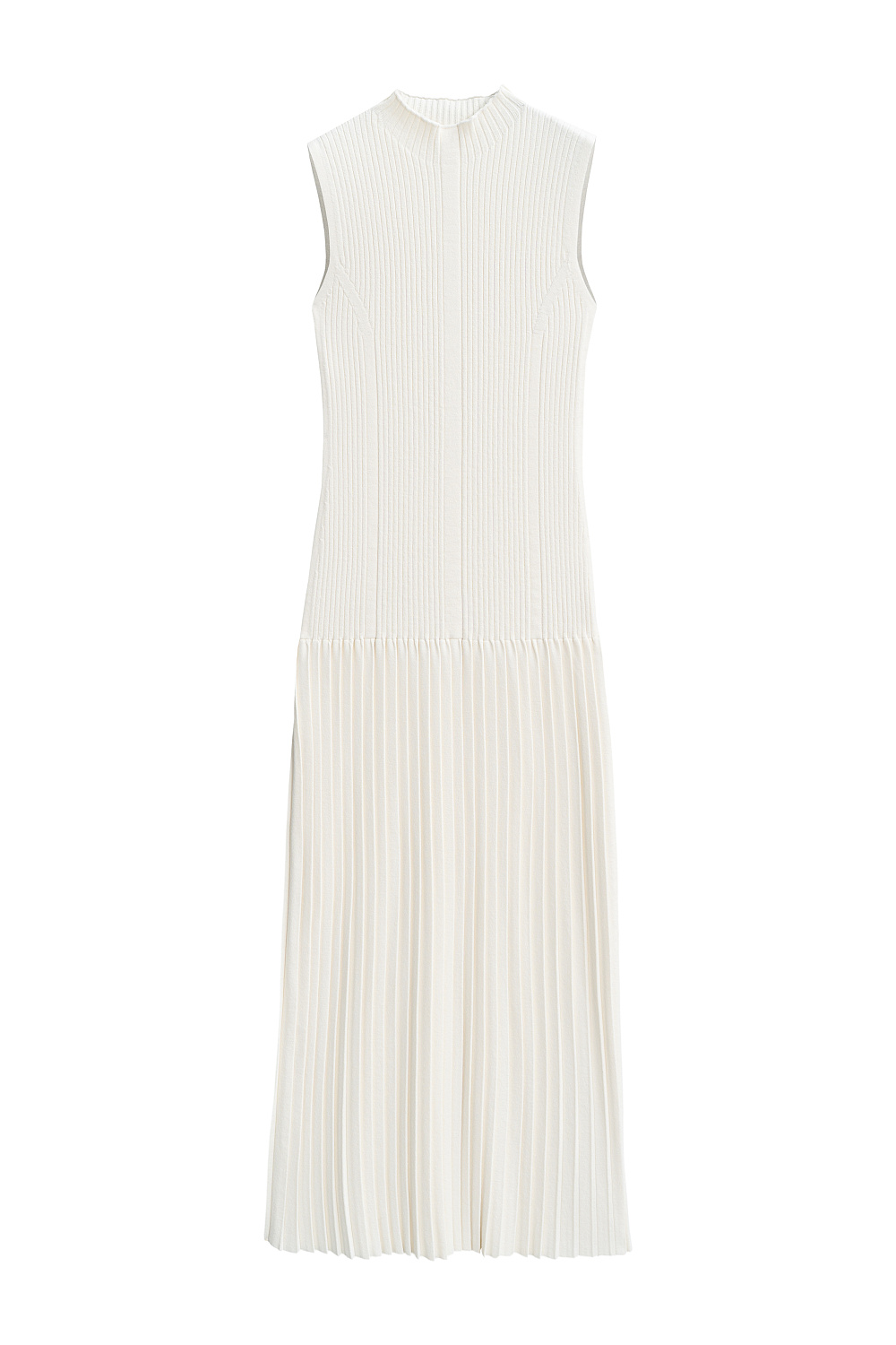 A maxi-length knit viscose dress. It features a fitted, sleeveless silhouette, a low stand-up collar, and a pleated skirt that falls below the hips.
