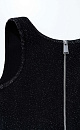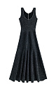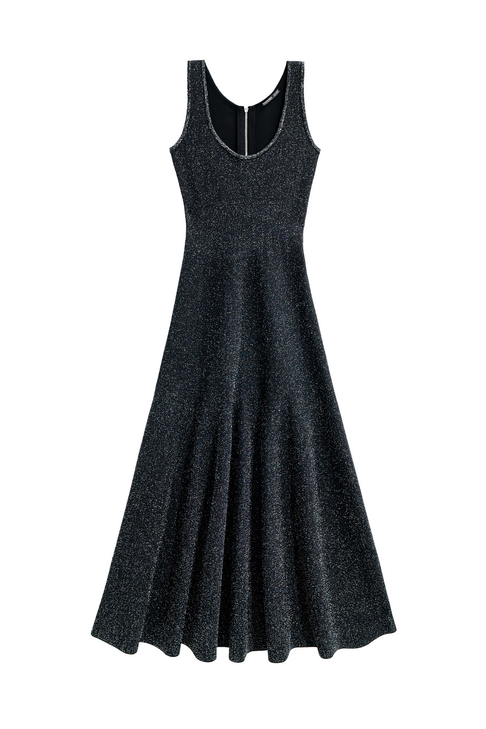A midi-length knit dress made of viscose with added lurex. It features a fitted silhouette, a flared skirt with soft pleats, sleeveless design, and wide straps. Zip closure at the back.