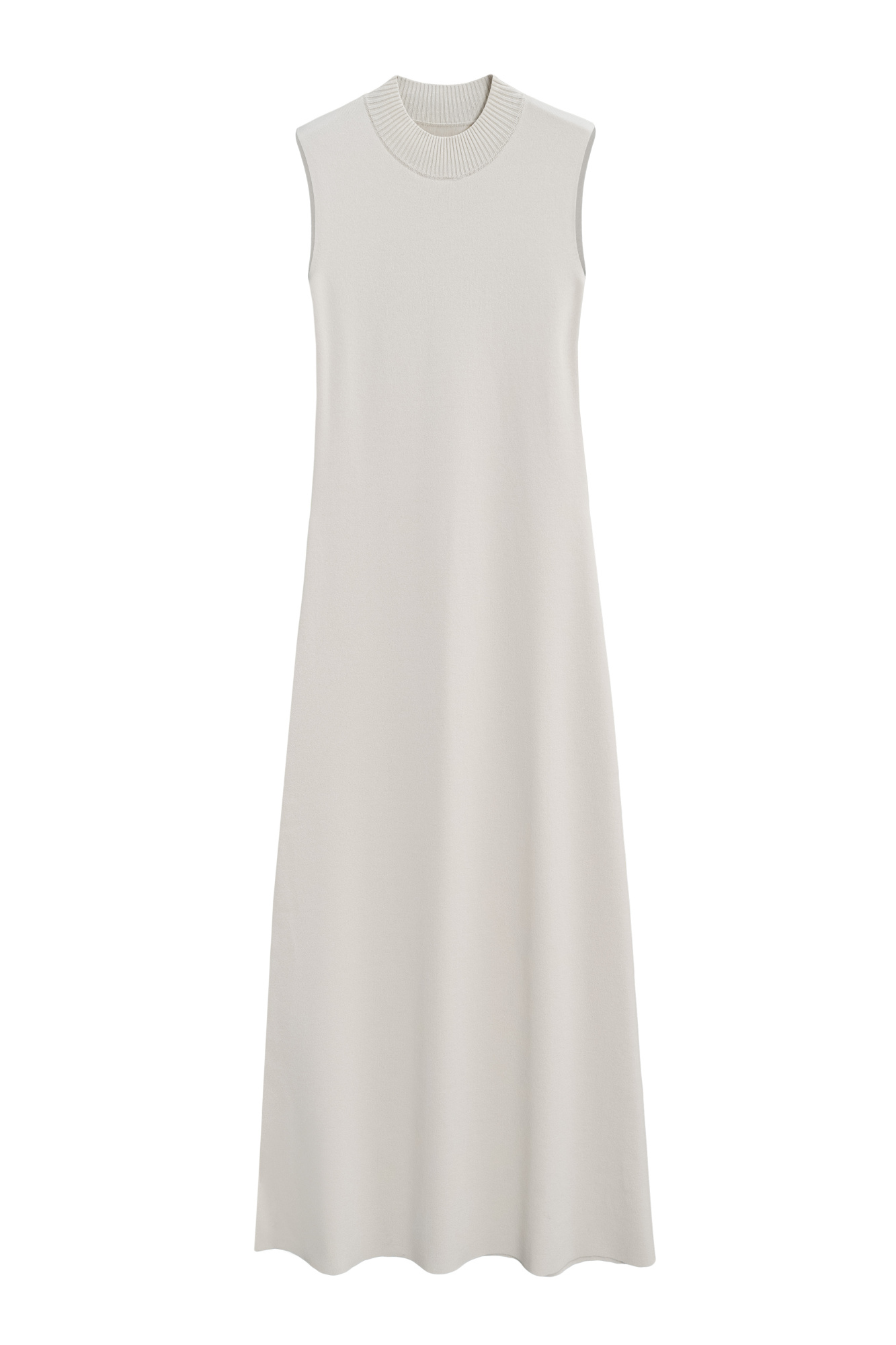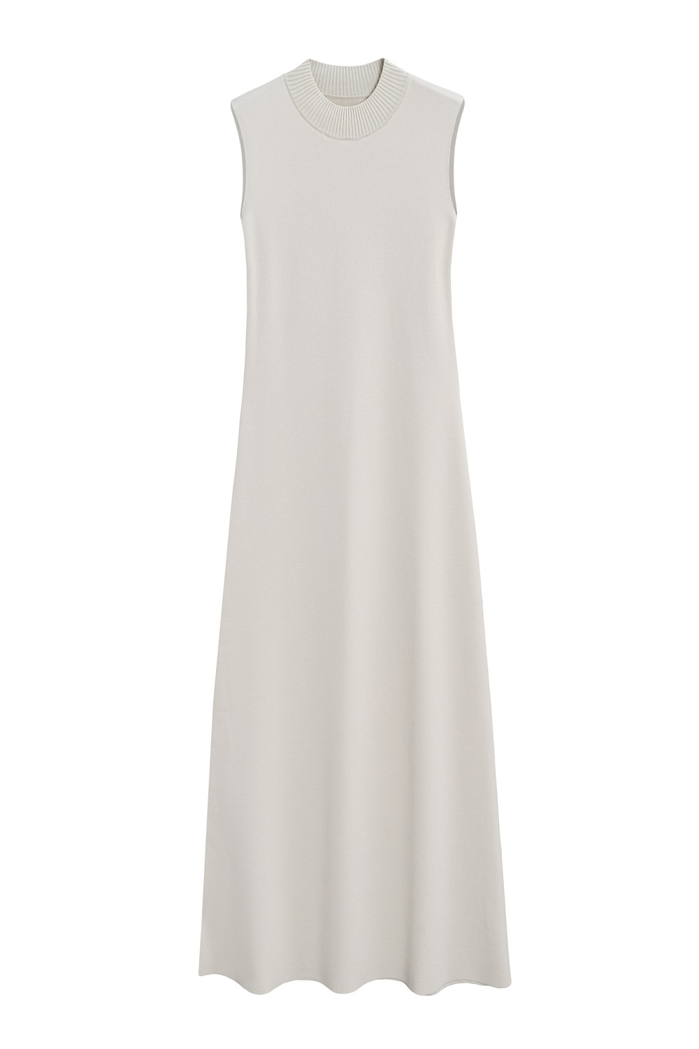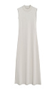 A midi-length knit dress made of viscose. It features a fitted silhouette, sleeveless design, and a low stand-up collar.