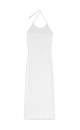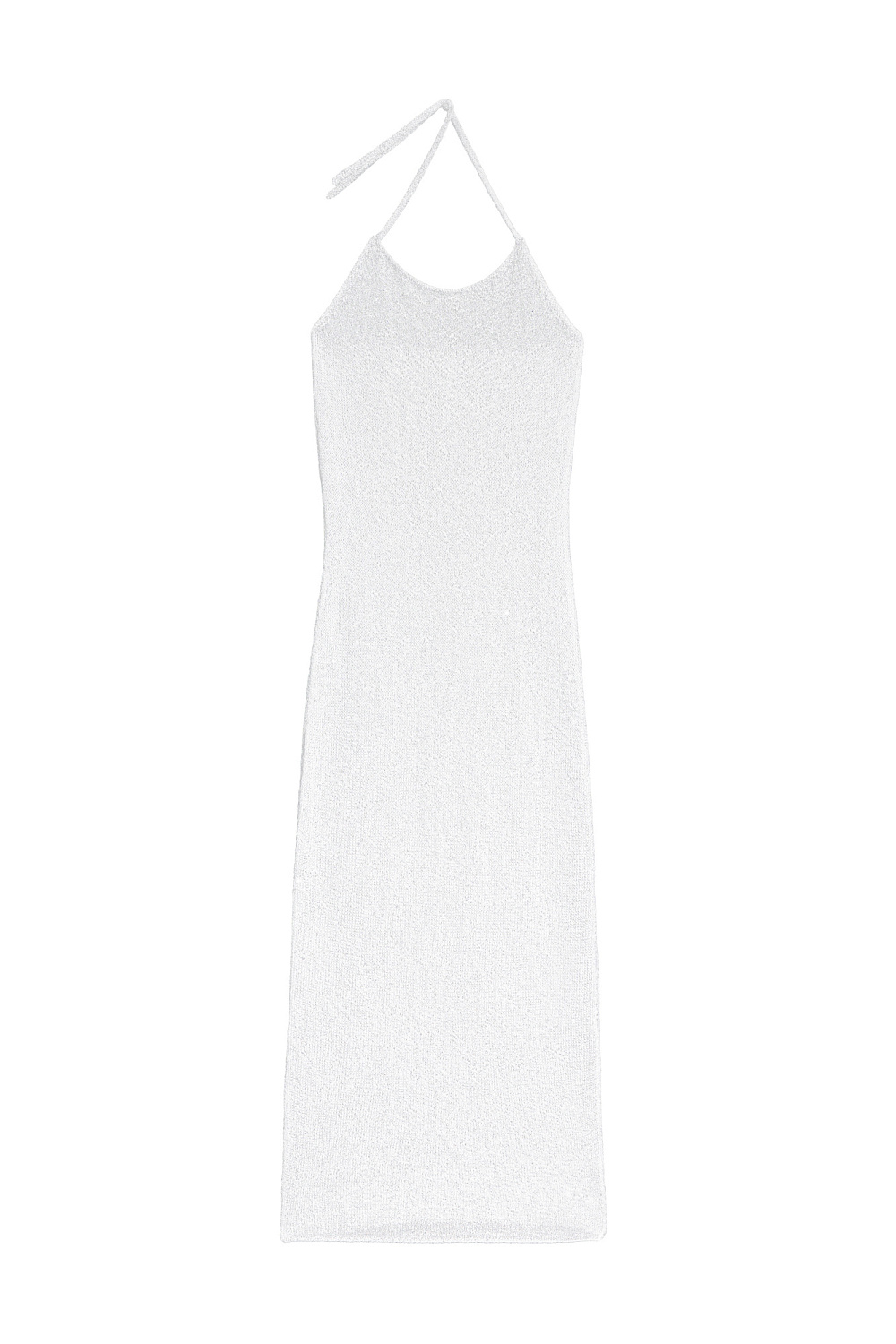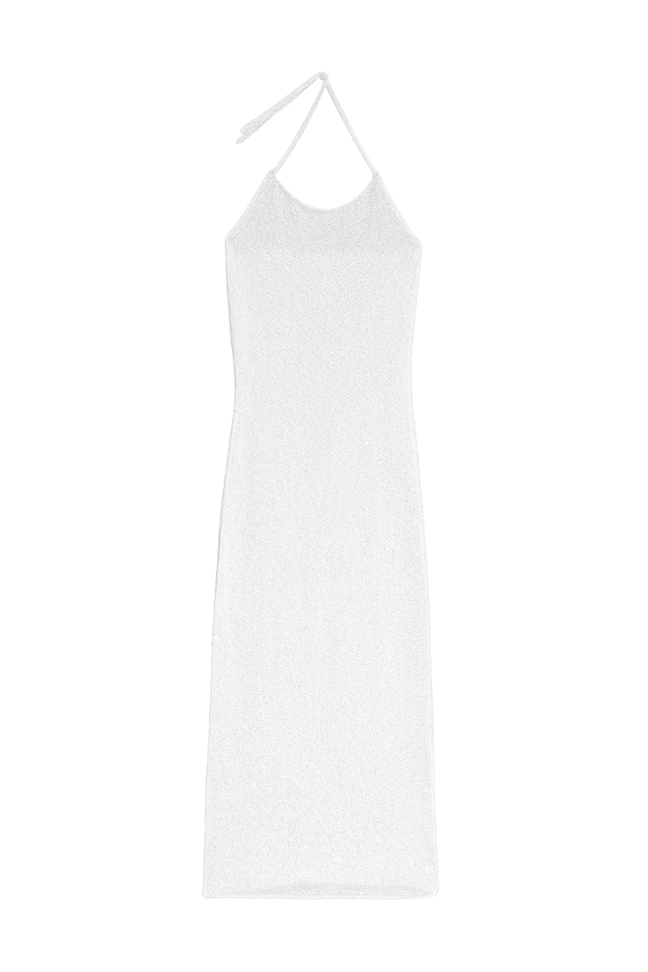 Knitted midi-length dress made of cotton with viscose. The product is decorated with small sequins. Straight cut model with an open back and two tie straps at the neck. No lining.