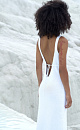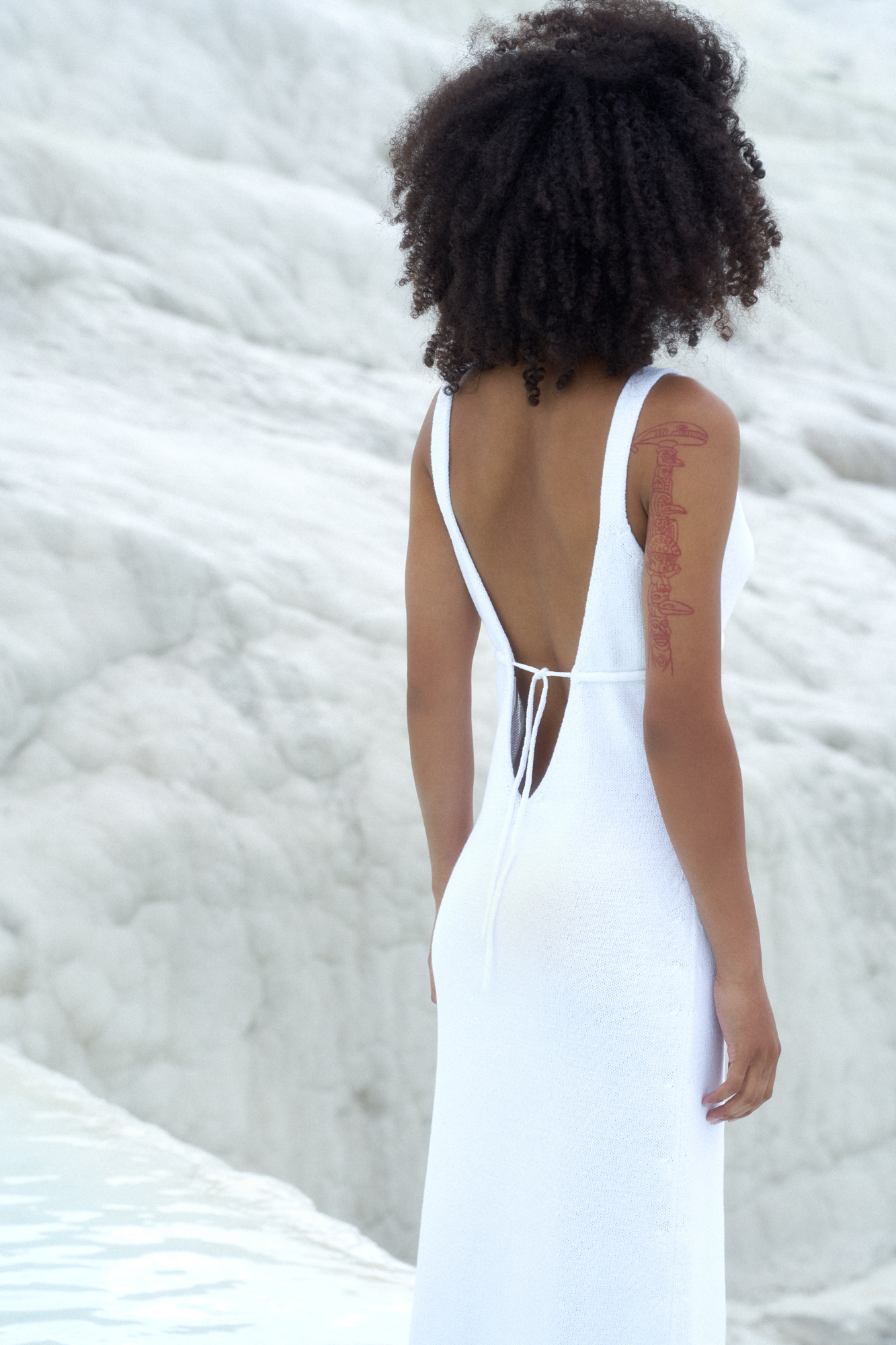 Sundress made of 100% cotton with a slit on the side, a thin drawstring around the neck and a cutout at the back.