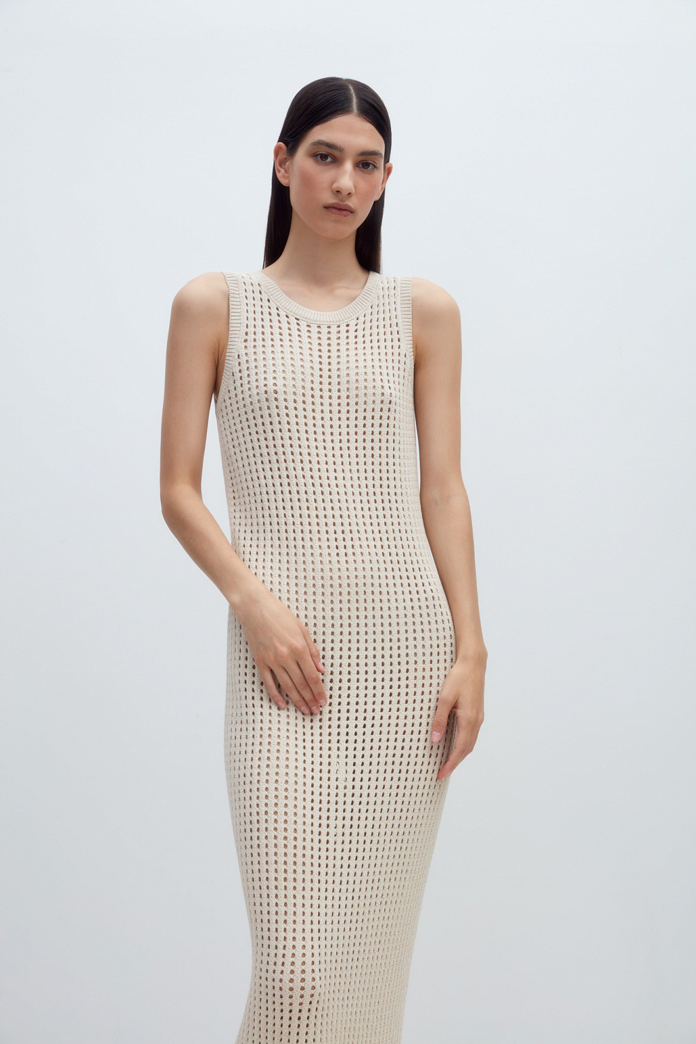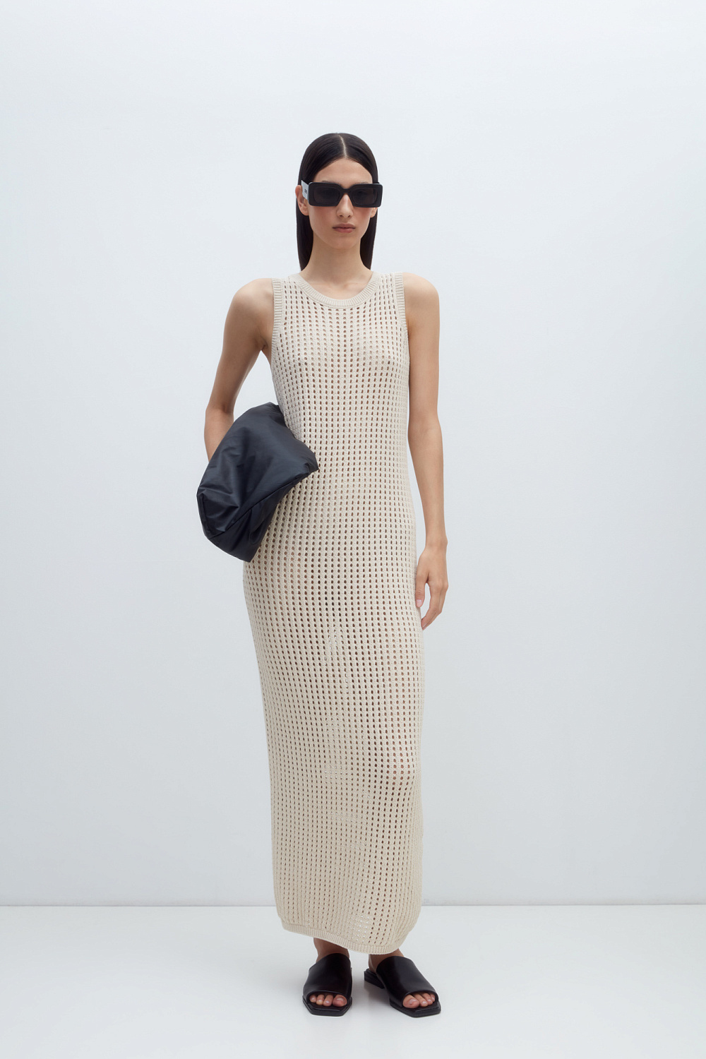 Knitted cotton maxi sundress with open shoulders and round neckline. Relaxed silhouette with perforation.