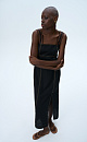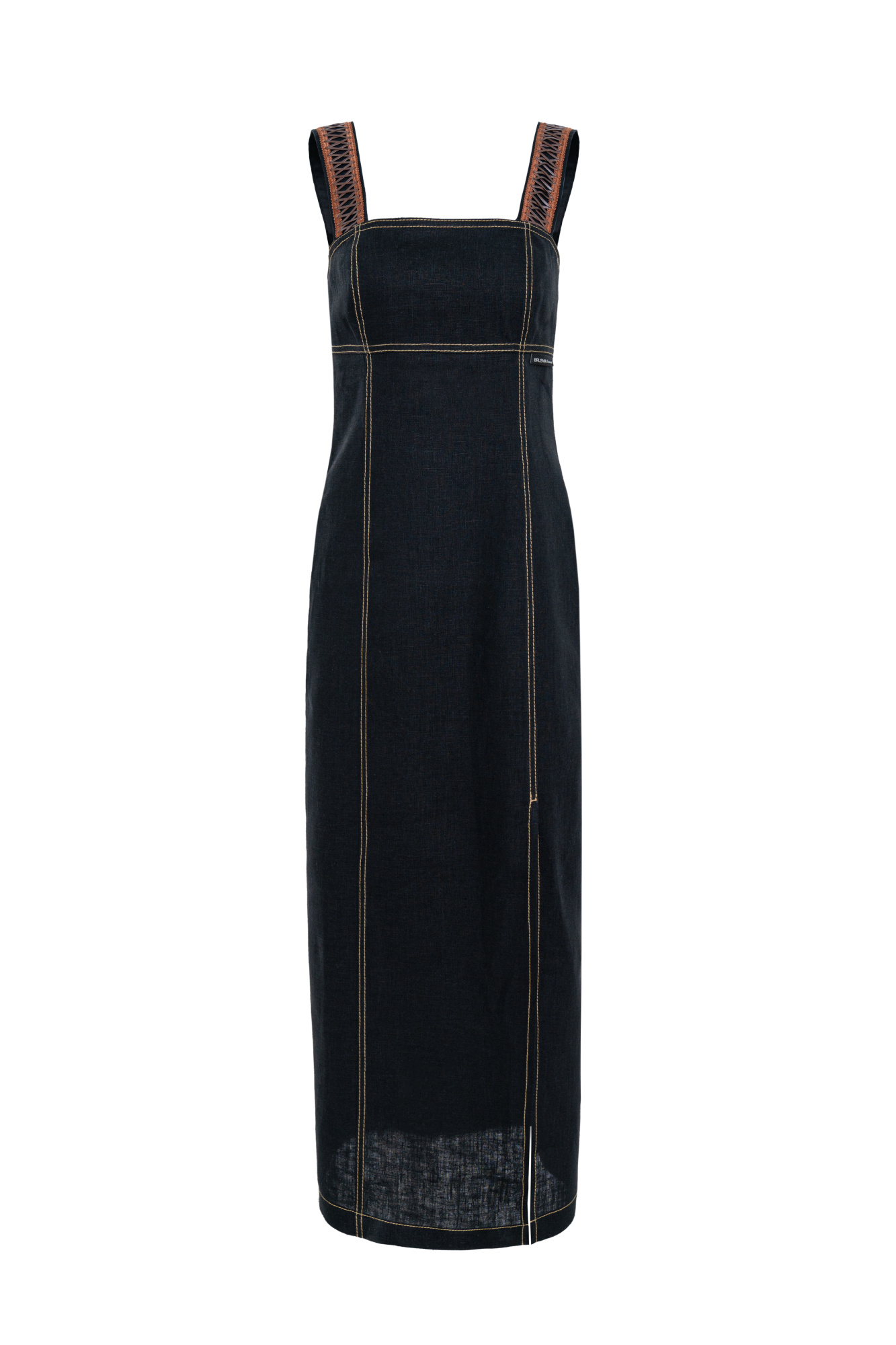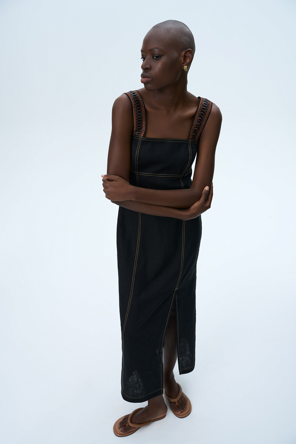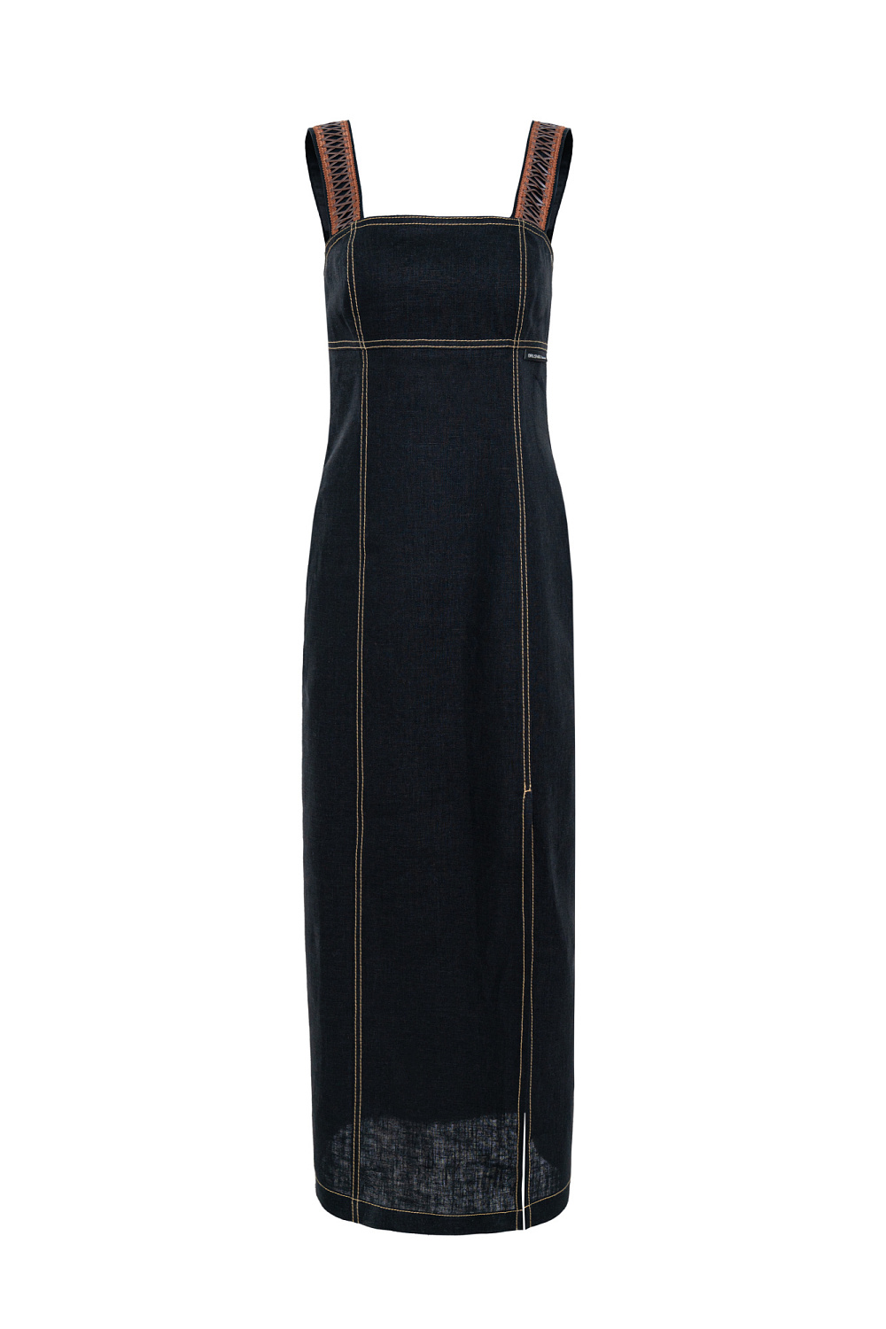 Linen sundress with side slit. Fitted silhouette, zip closure.