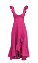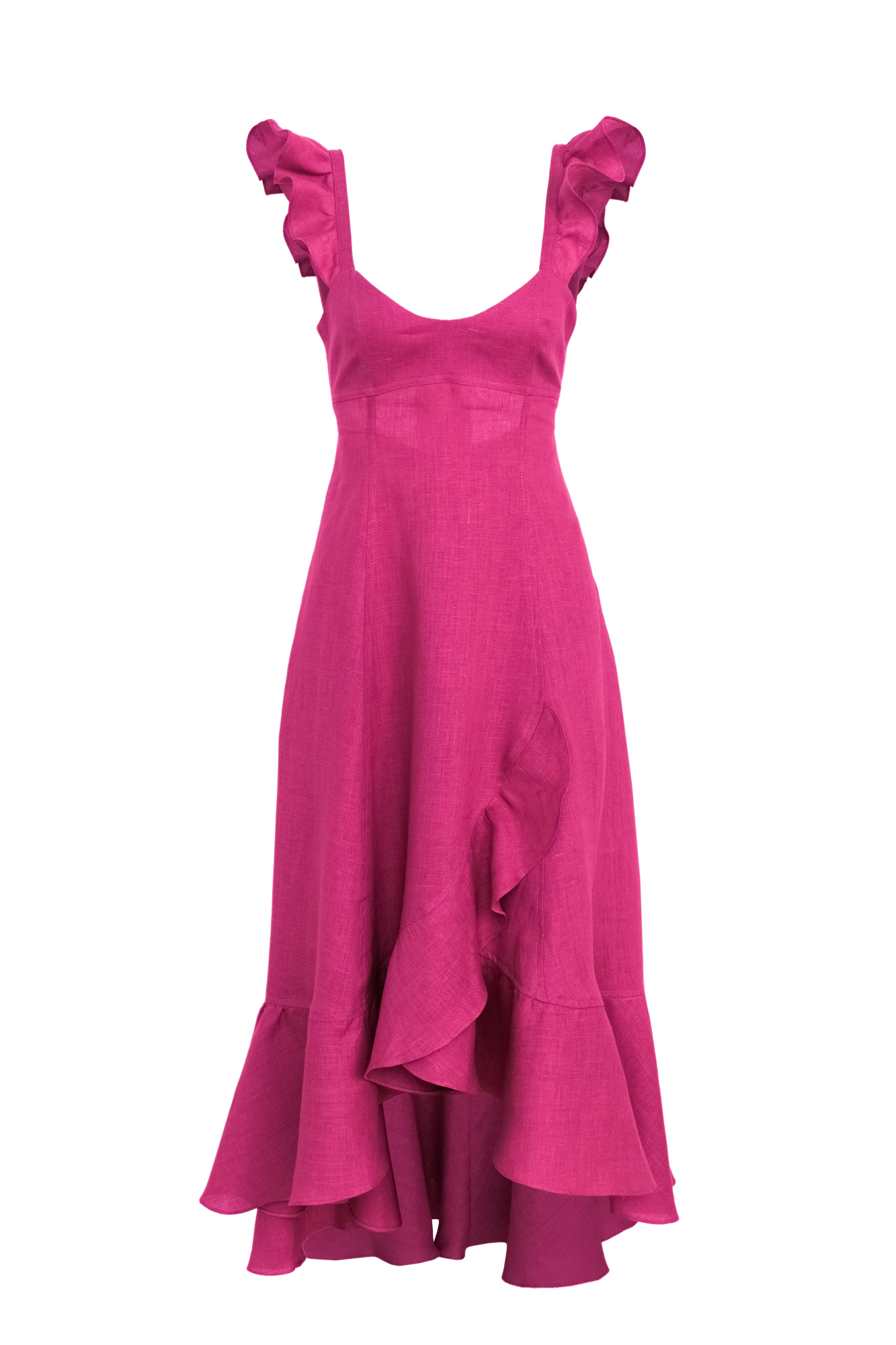 Linen midi sundress with an open back and asymmetric ruffle trim.