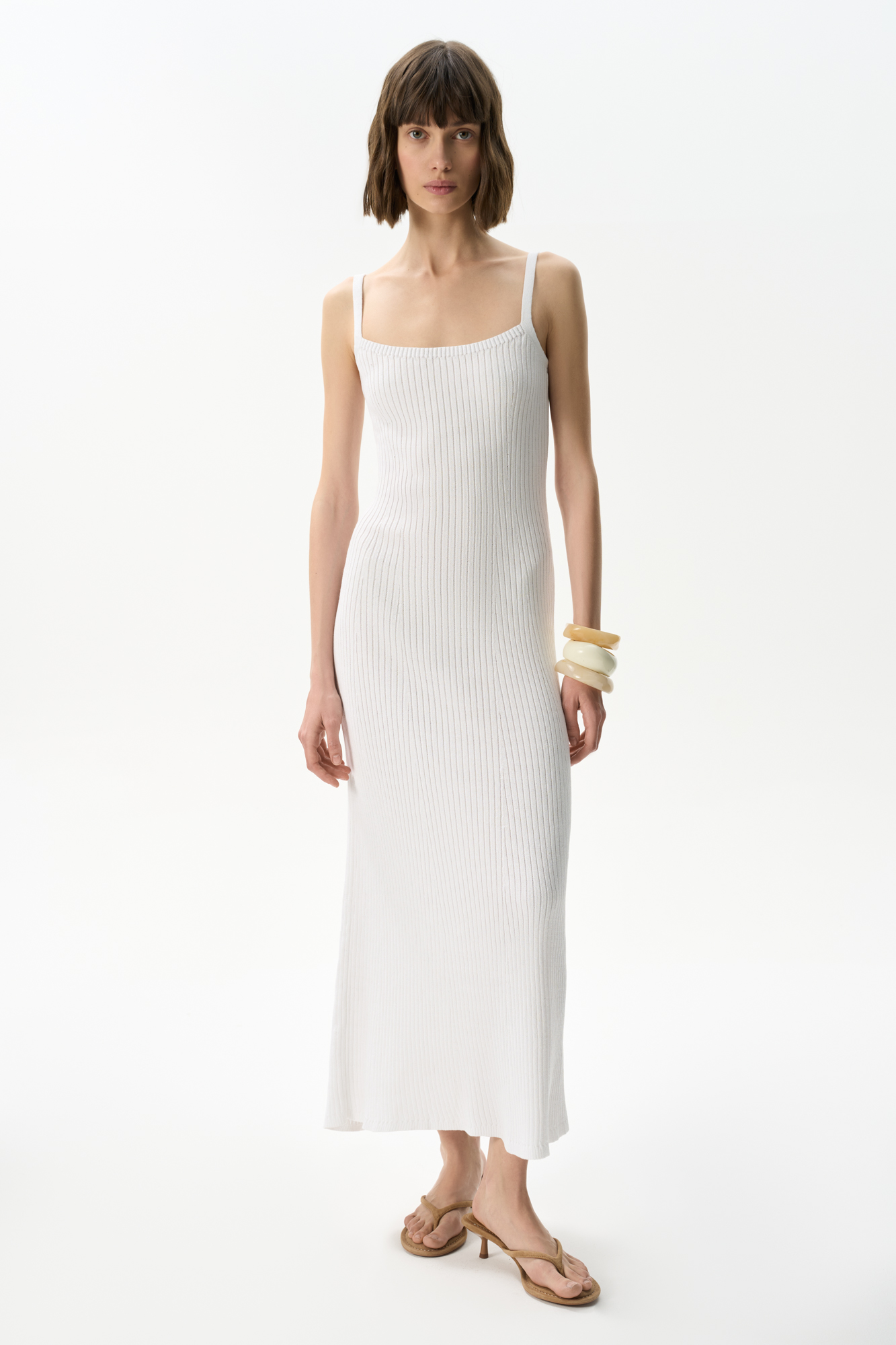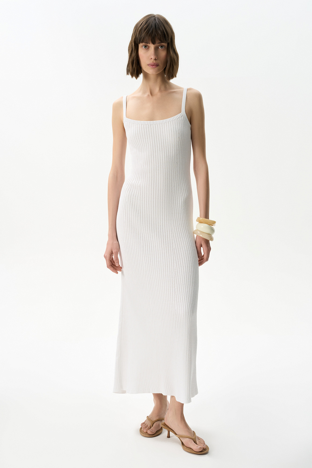Knitted sundress made of cotton with the addition of viscose. Model of a fitted silhouette, sleeveless, with straps. The product is made with a wide rib.