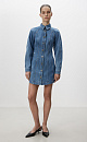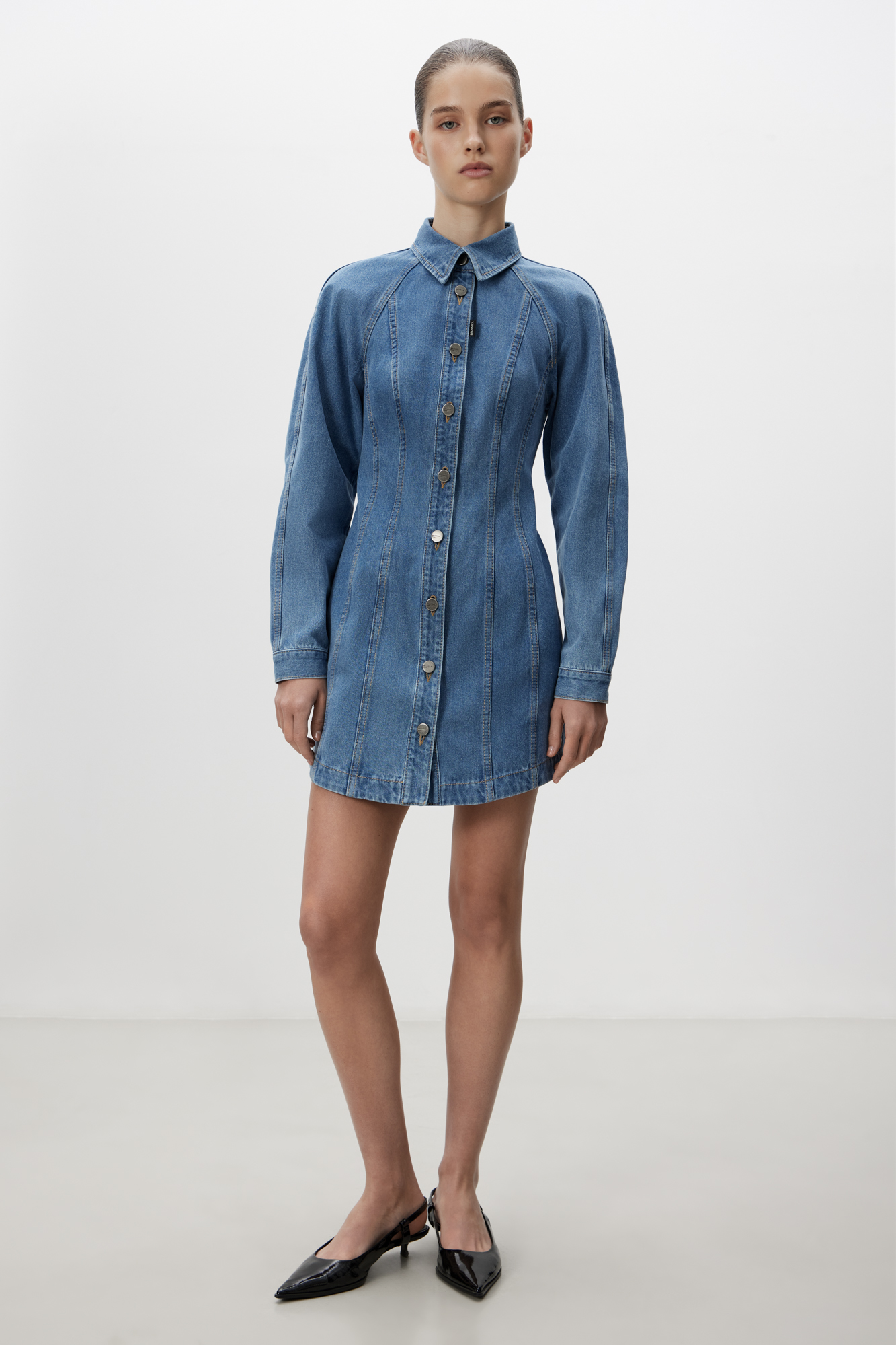 Denim dress made of 100% cotton, mini length. The model has a fitted silhouette, long raglan sleeves and a turn-down collar. Button closure.