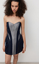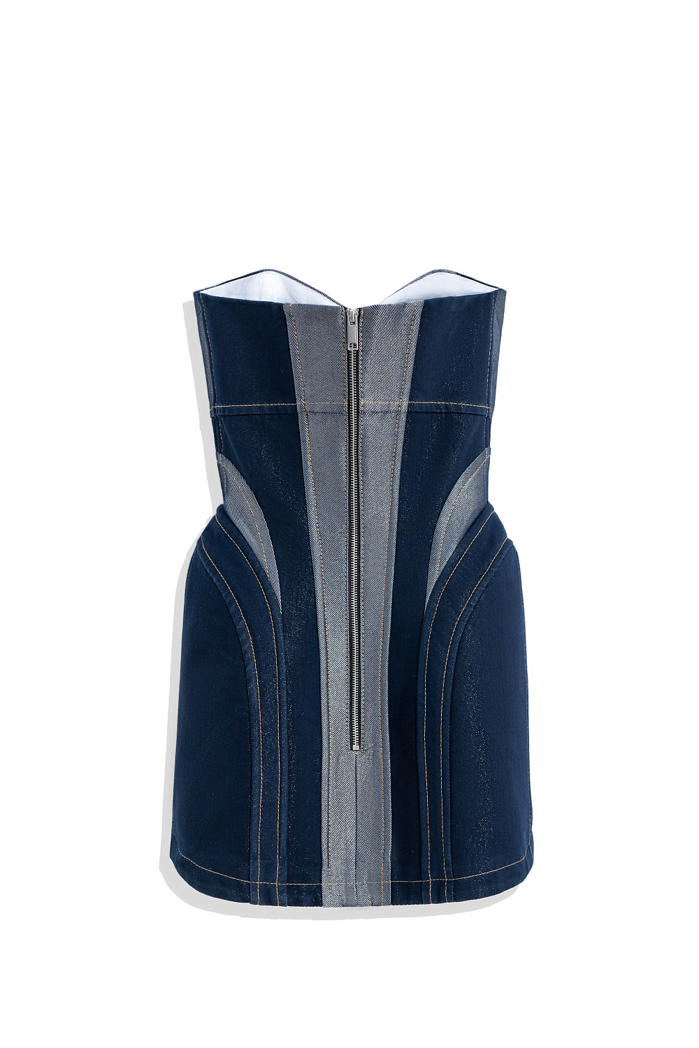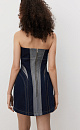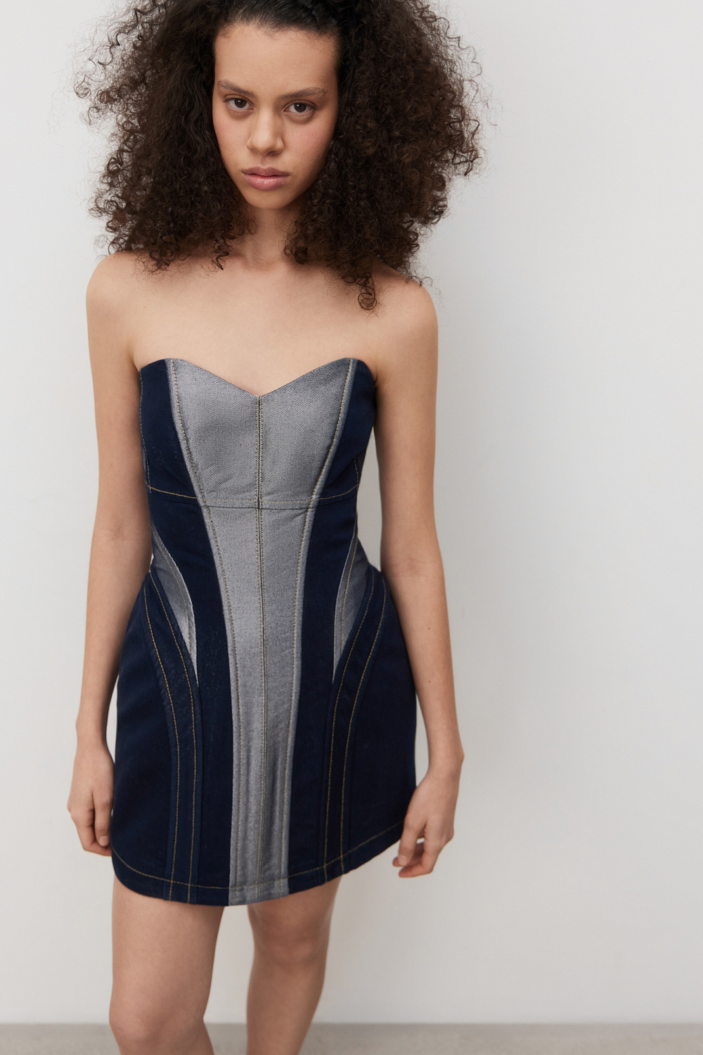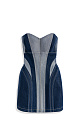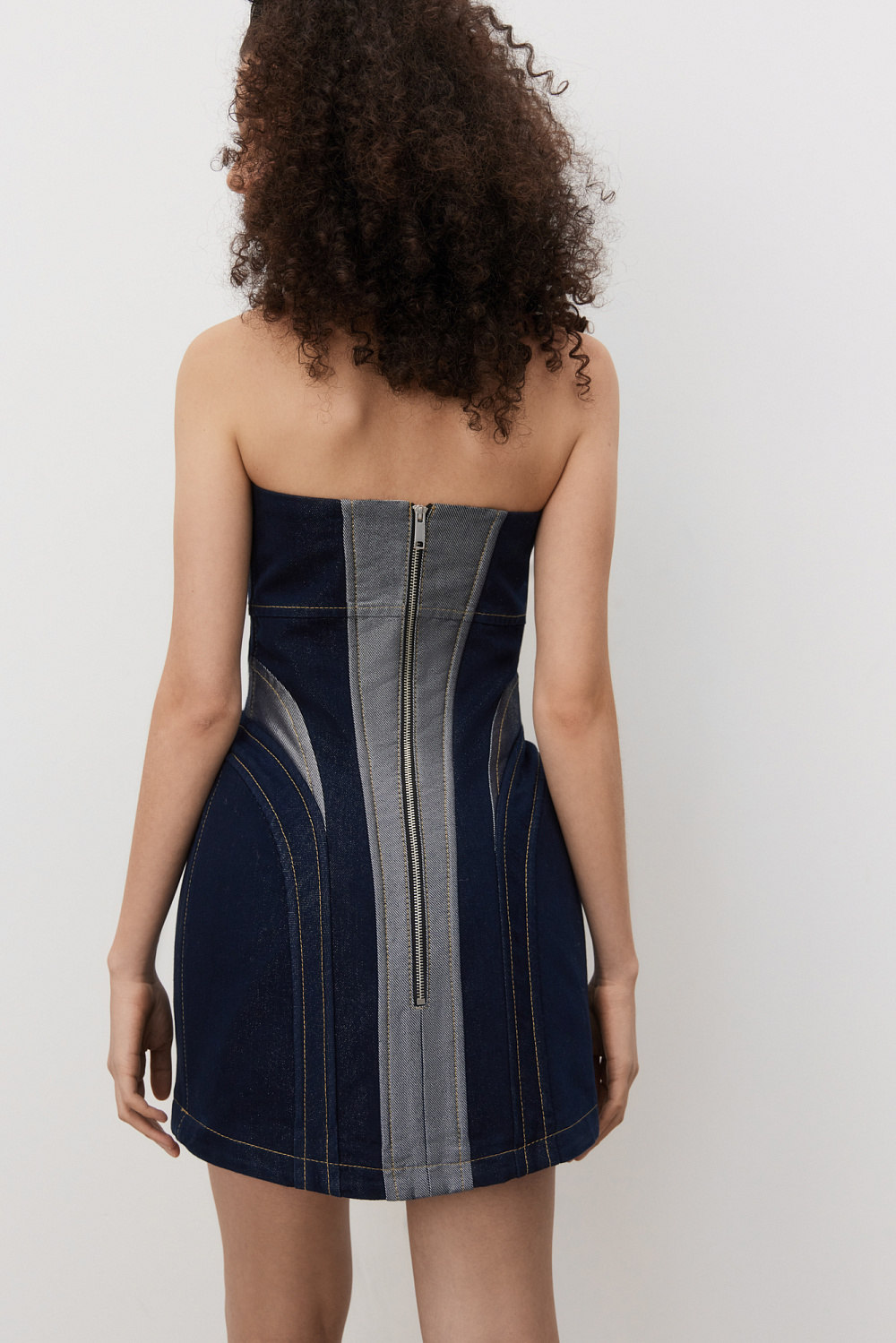 Mini denim dress with metallic thread. A fitted model with a corset top and a figured neckline. The item is lined with padding at the hips to create an hourglass silhouette. Zip fastening at the back.
