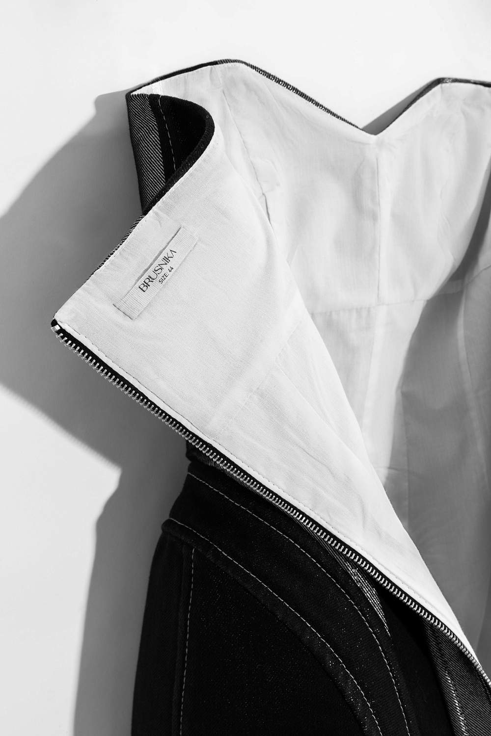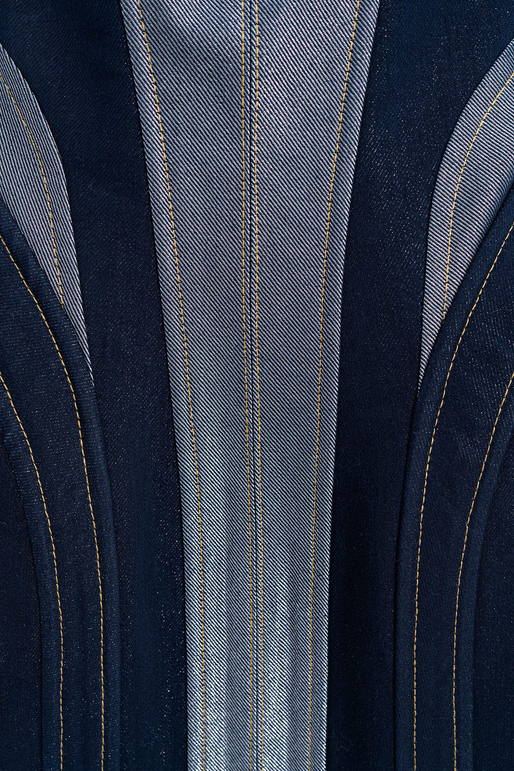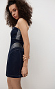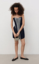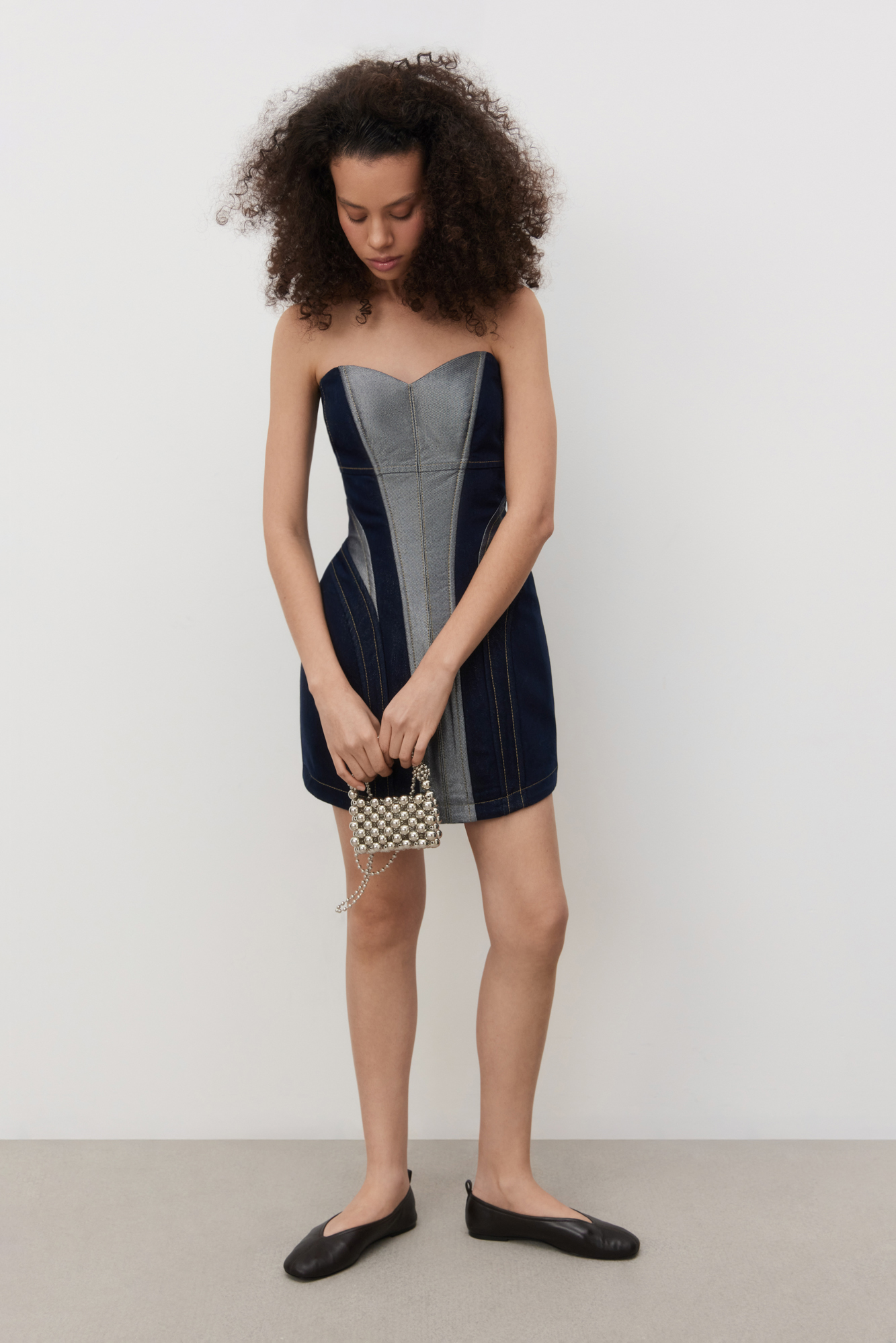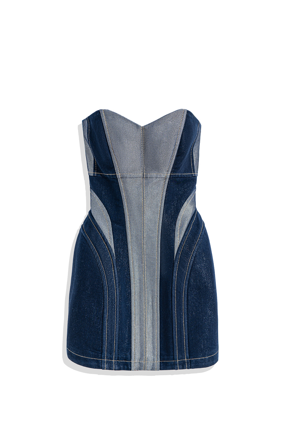 Mini denim dress with metallic thread. A fitted model with a corset top and a figured neckline. The item is lined with padding at the hips to create an hourglass silhouette. Zip fastening at the back.