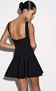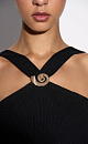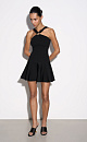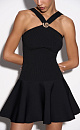 Knitted mini-length dress made of viscose. The model has a fitted silhouette with wide straps crossed on the bodice and decorated with a shell-shaped buckle. The product has an open back, a knitted bodice and a circle skirt.