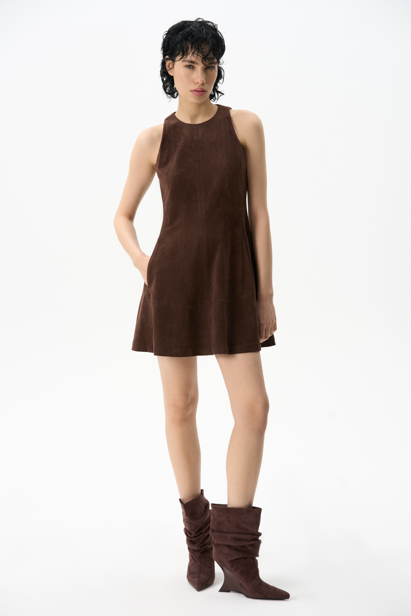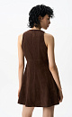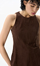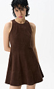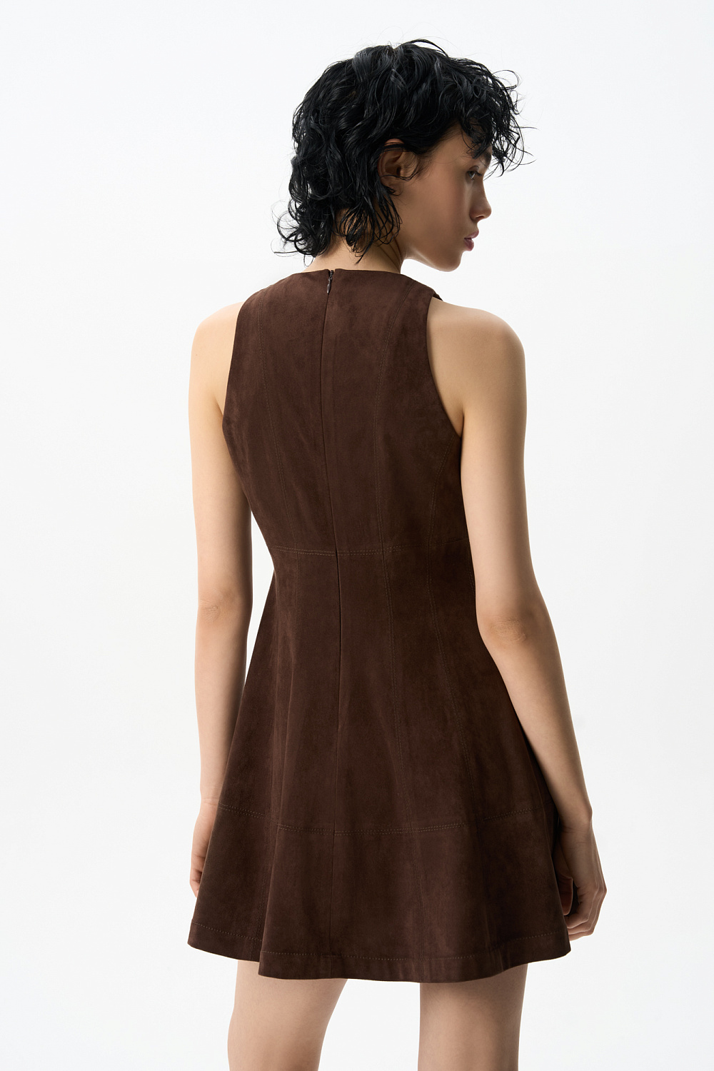 Mini-length dress made of fabric with an imitation of the appearance and properties of natural suede. The model has a fitted silhouette, sleeveless, with a round neckline and wide straps. Zip fastening on the back.