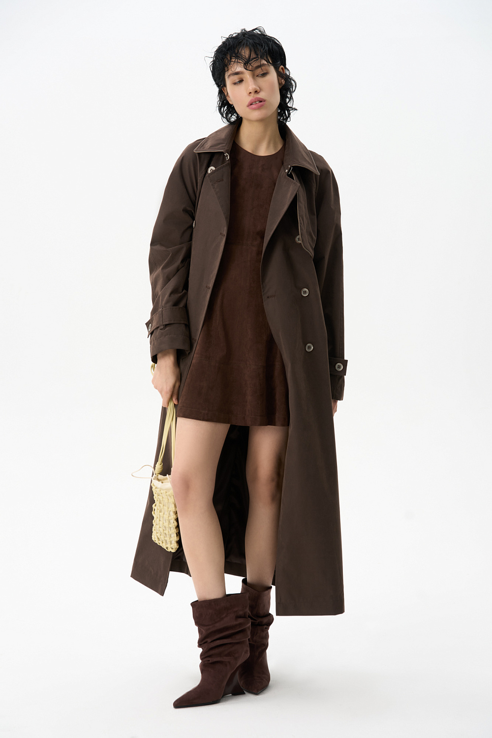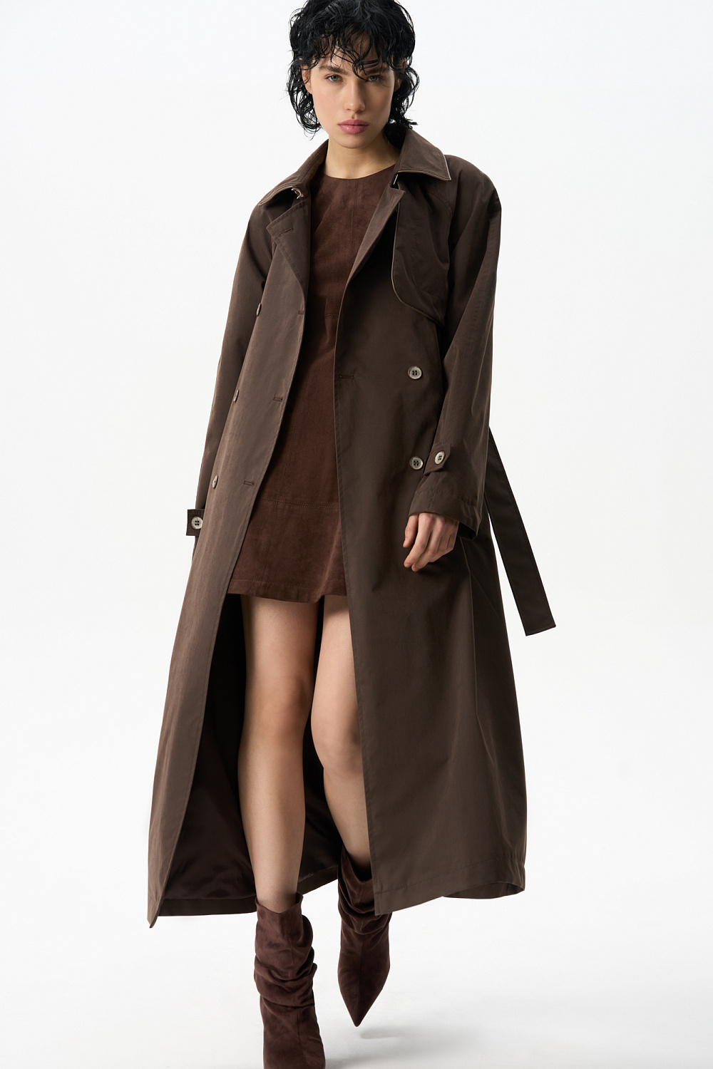 Double-breasted suede trench coat