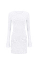 Organic cotton knitted mini dress. The model has a fitted silhouette, with long flared sleeves, slits at the cuffs and a round neckline.
