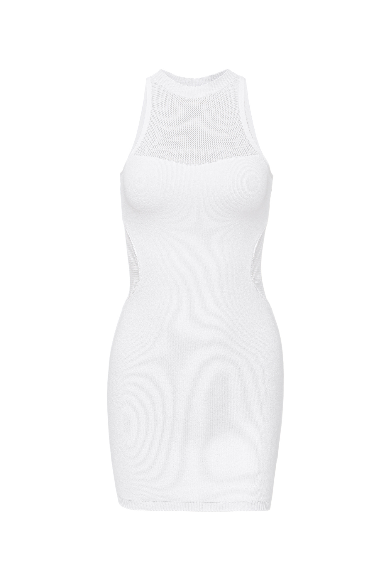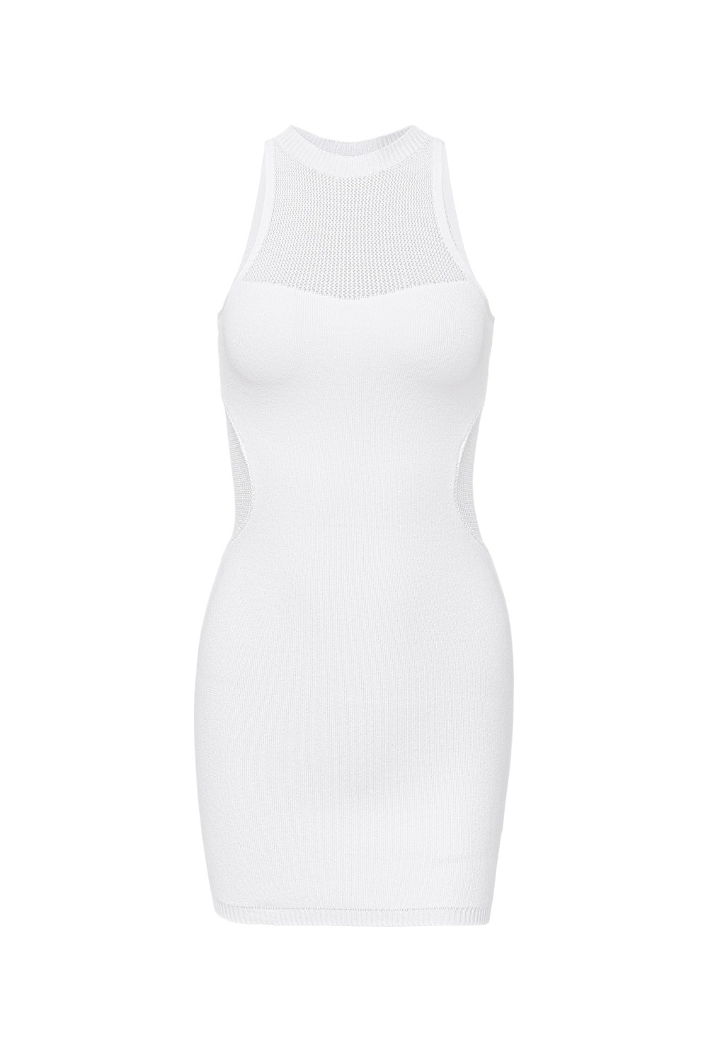 Knitted open shoulder mini viscose dress.Features halter neck and mesh inserts.