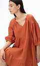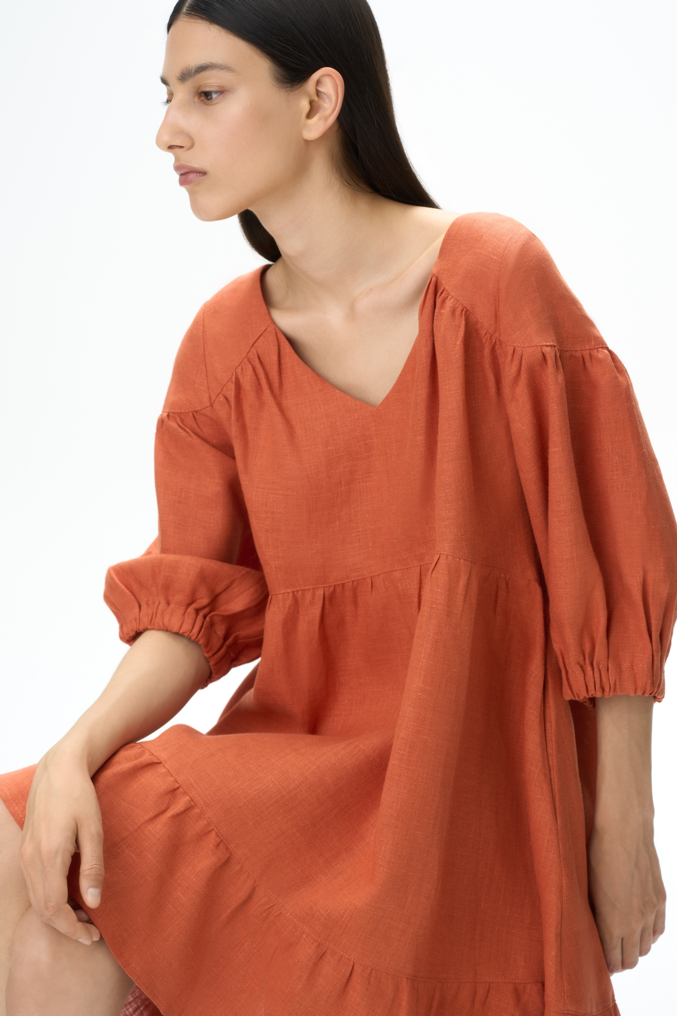 100% linen mini dress with a flare from the waist and a wide asymmetrical flounce at the bottom. Short balloon sleeves with elastic cuffs. V-neckline with ties at the back.