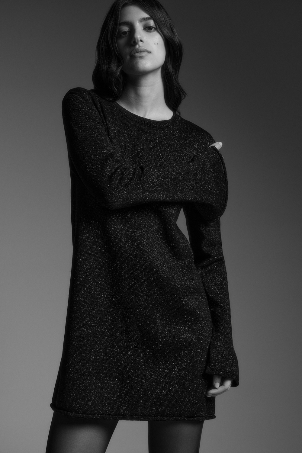 Knitted mini-length dress made of viscose with the addition of lurex. Loose fit with a round neckline and rolled hem.