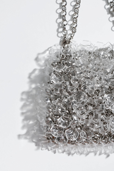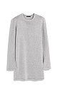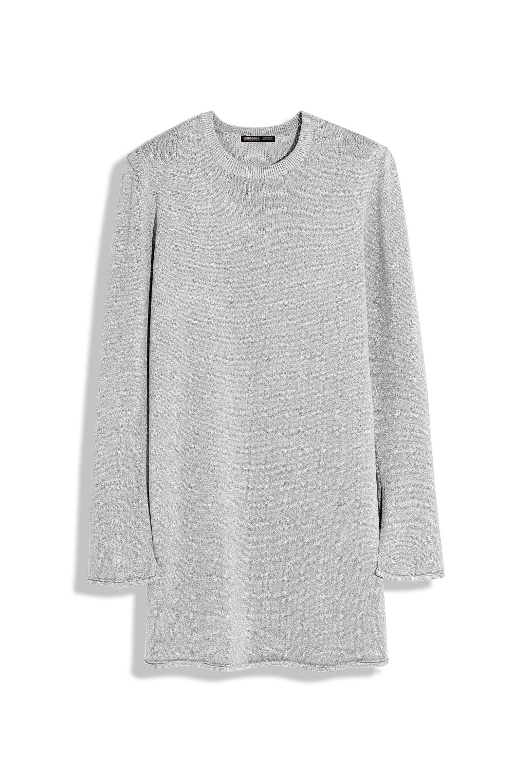 Knitted mini-length dress made of viscose with the addition of lurex. Loose silhouette model with a round neck and long sleeves. The edges of the product are decorated with a roller.